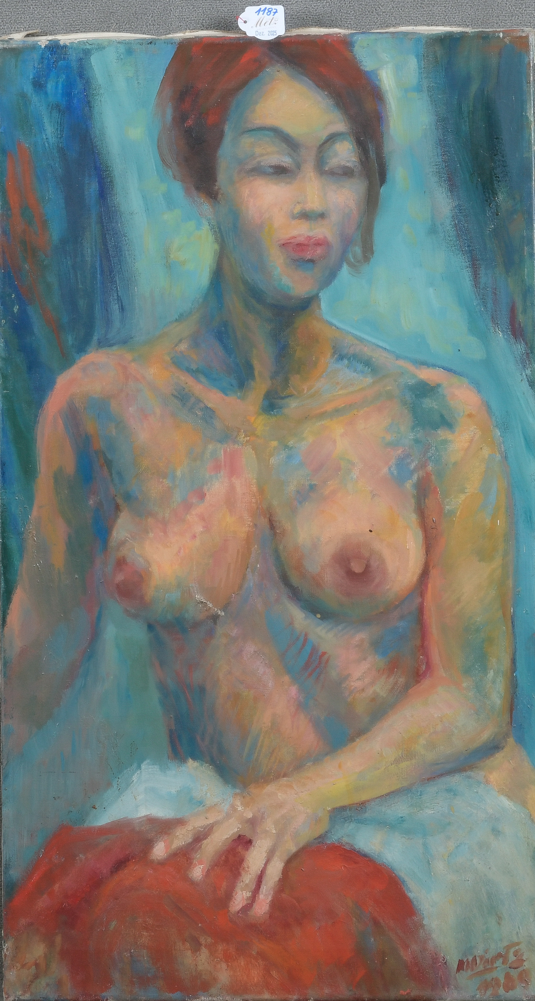 - Katalog-Nr: 1187Werner Dietz (1927-2012). Sitzender weiblicher Halbakt. Öl/Lw., re./u./sign./dat. 1989, mit Passepartout hi./Gl. gerahmt, 81 x 45 cm. (besch.)o.L.