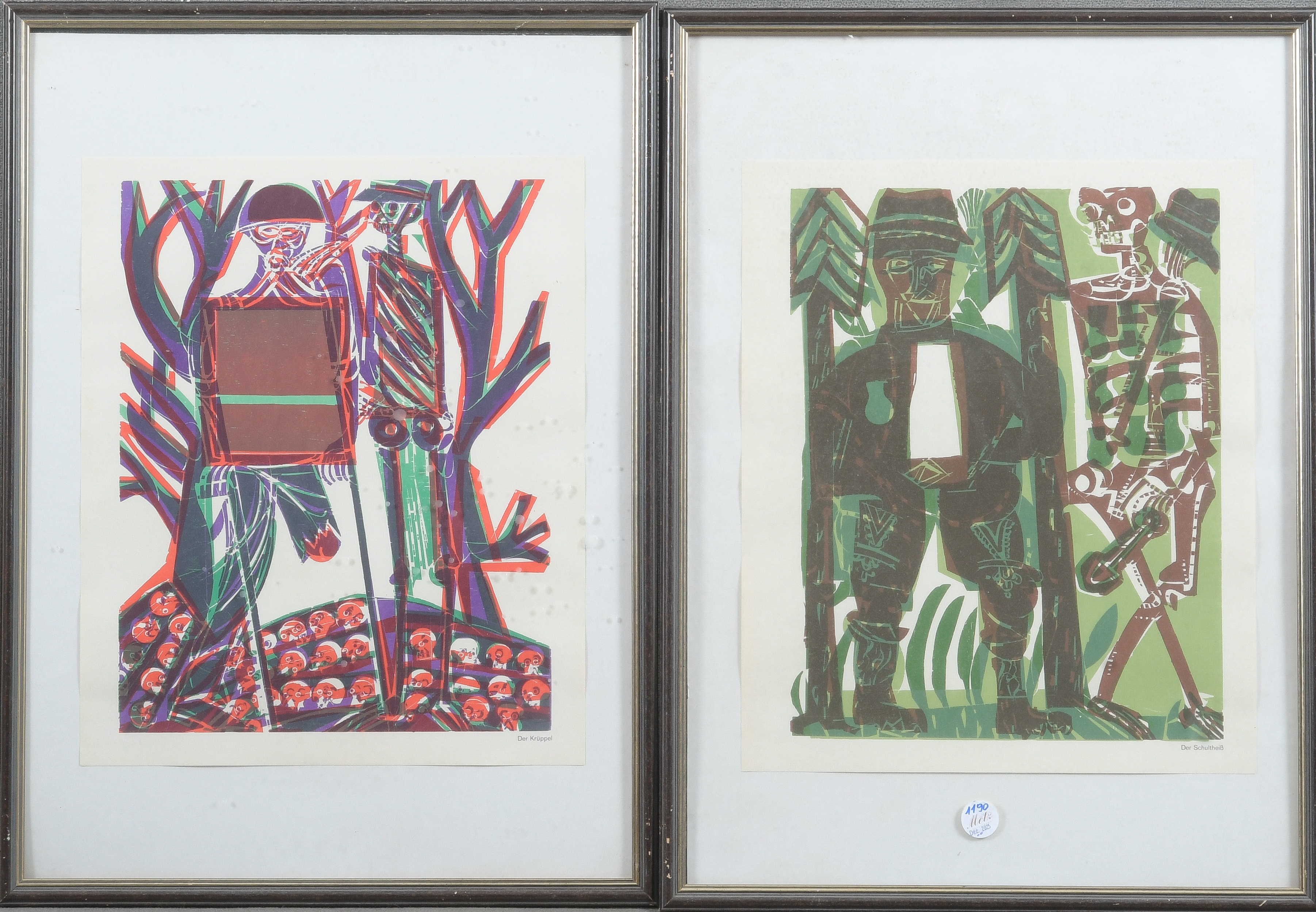 - Katalog-Nr: 1190HAP Grieshaber (1909-1981). „Der Krüppel“ und „Der Schulthaiß“. Zwei Farbholzschnitte, hi./Gl. gerahmt, 45,5 x 35 / 46 x 35 cm.o.L.