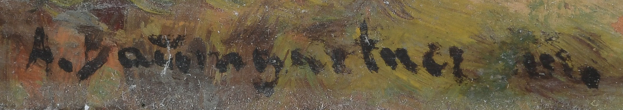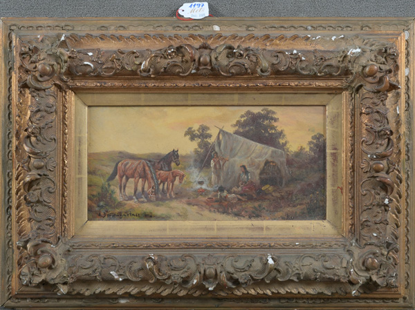 - Katalog-Nr: 1197Adolf Baumgartner (1893-1939). Rastende Personen an Weg mit drei Pferden. Öl/Holz, li./u./sign./dat. 1920, gerahmt, 16 x 31,5 cm. (besch.)o.L.