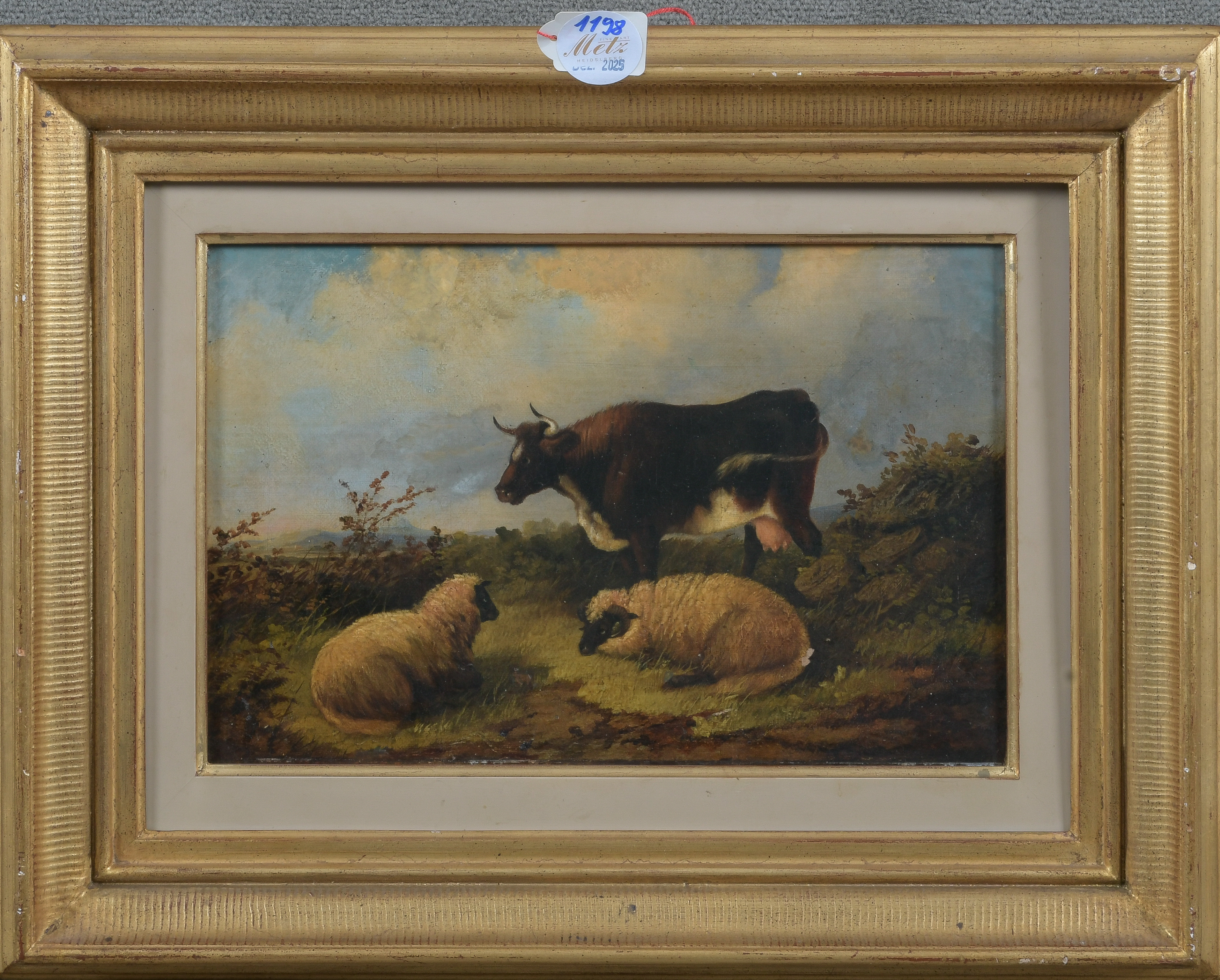 - Katalog-Nr: 1198Maler des 18./19. Jhs. Weidevieh in Landschaft. Öl/Lw., auf Holz aufgezogen, gerahmt, 20,5 x 30,5 cm.o.L.