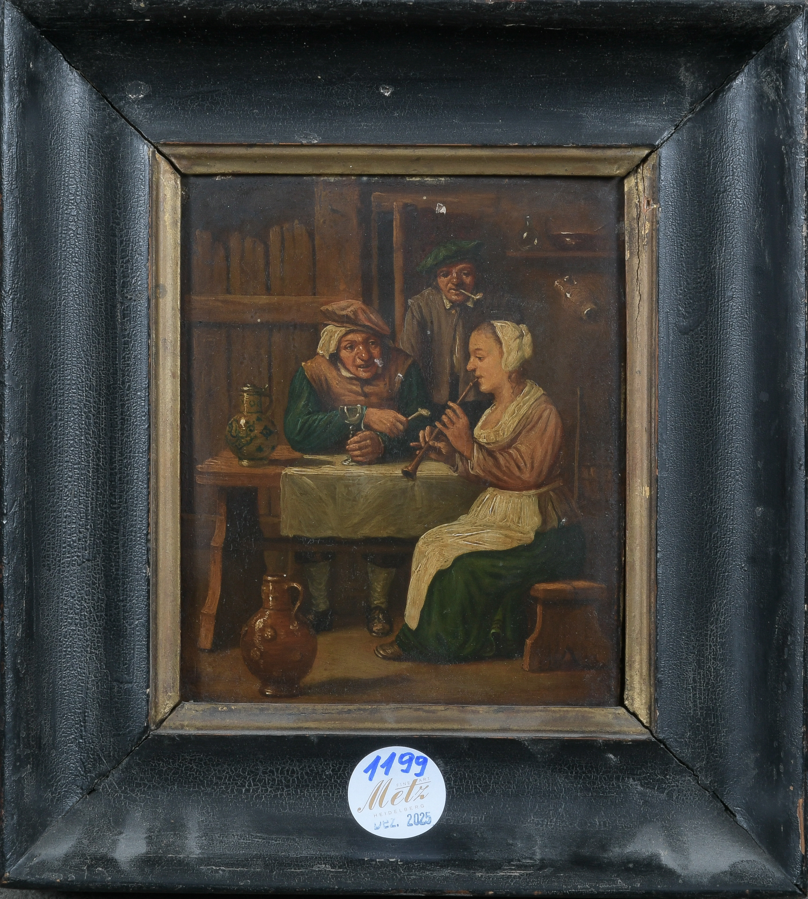 - Katalog-Nr: 1199Maler des 18. Jhs. Wirtshausszene mit musizierender Dame und zwei männlichen Zuhörern. Öl/Holz, gerahmt, 17 x 14 cm.o.L.