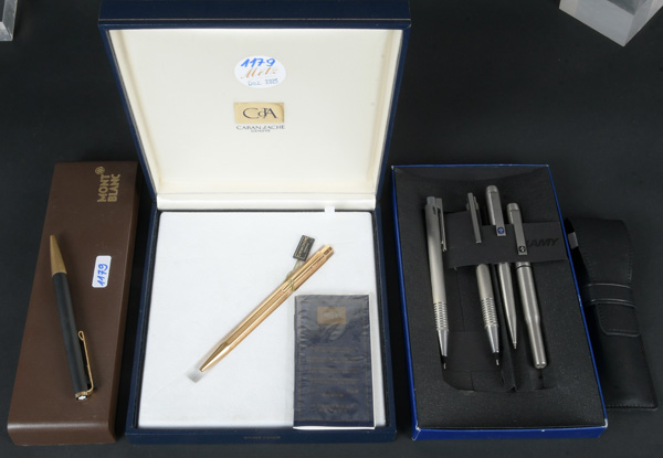 - Katalog-Nr: 1179Konvolut Bleistifte, Füllfederhalter und Kugelschreiber, u.a. „Caran d'Ache“, „Lamy“ und „Montblanc“, teilw. in Etui. (Funktion ungeprüft)o.L.