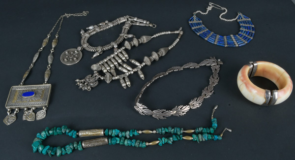 - Katalog-Nr: 1194Konvolut Schmuck: Colliers und Halsketten. Silber, teilw. besetzt mit Lapizlazuli und Türkis, Gesamtgewicht ca. 400 g, L=33 bis 55 cm.o.L.