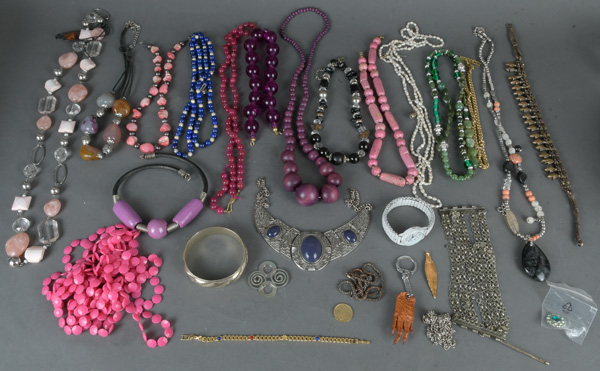 - Katalog-Nr: 1196Konvolut Modeschmuck, meist Colliers und Halsketten, teilw. besetzt mit Jade, Lapislazuli und Rosenquarz, L=40 bis 70 cm.o.L.