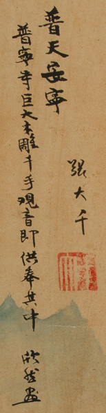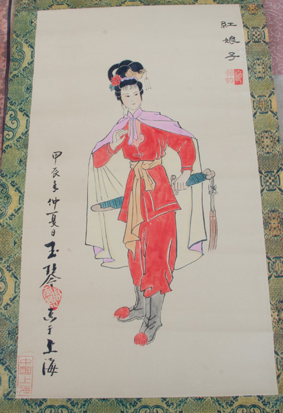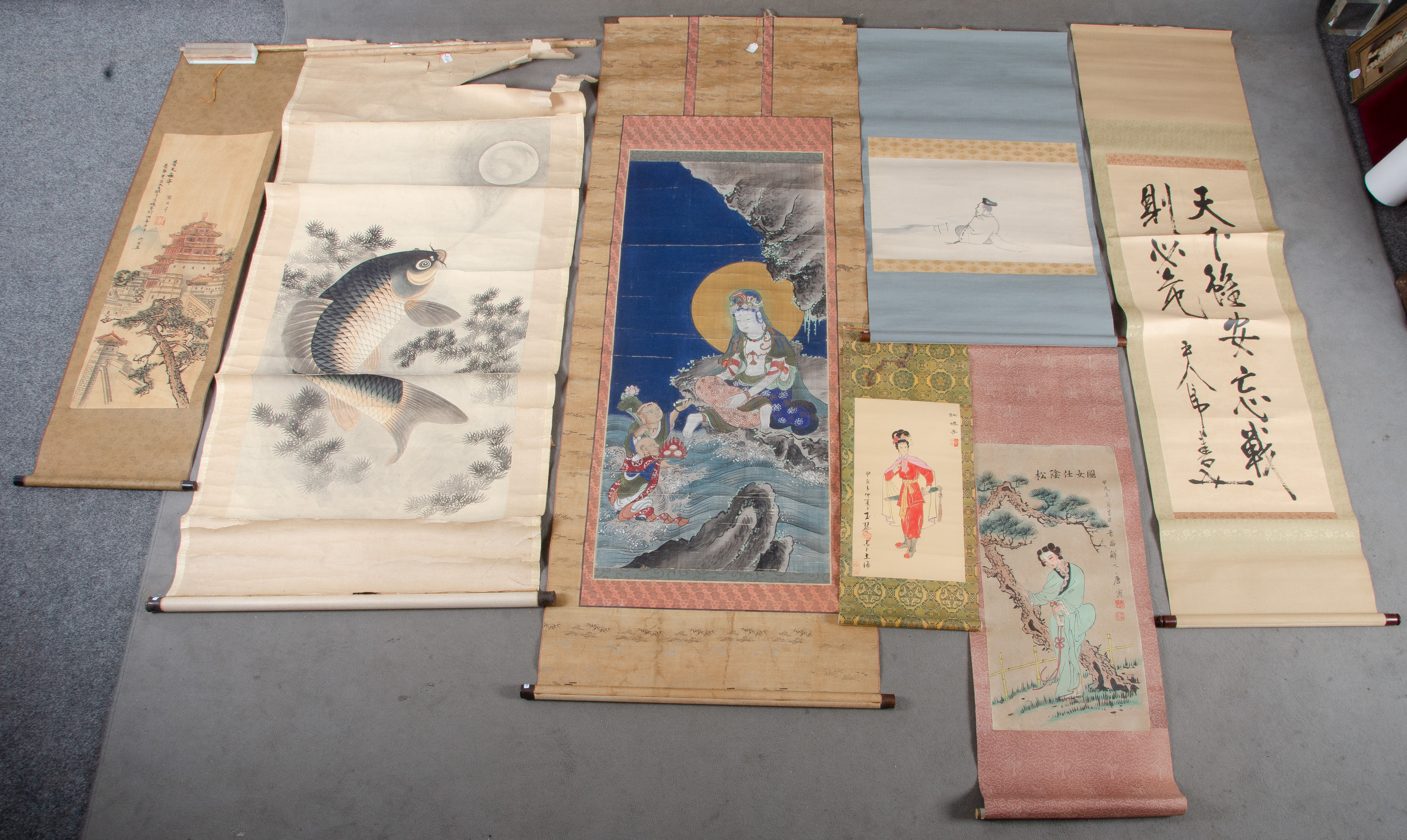 - Katalog-Nr: 2554Sieben Rollbilder. Asien. Papier / Seide, bunt bemalt mit Fischen, Gebäuden, Personen und Schriftzeichen, 45 x 25 bis 122 x 65 cm.o.L.