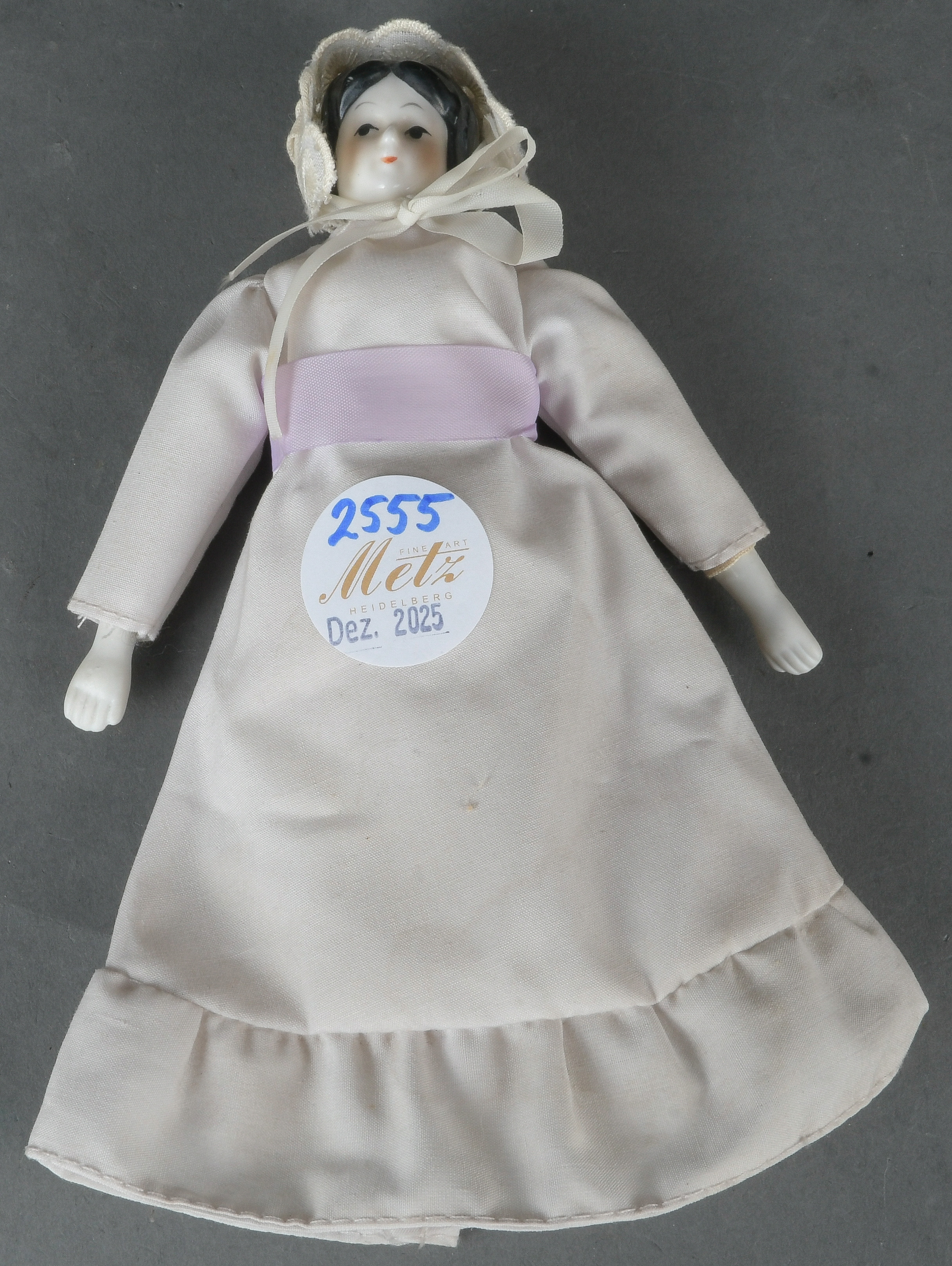 - Katalog-Nr: 2555Porzellankopfpuppe. Wohl deutsch um 1900. Mit Stoffkörper, H=20 cm.o.L.