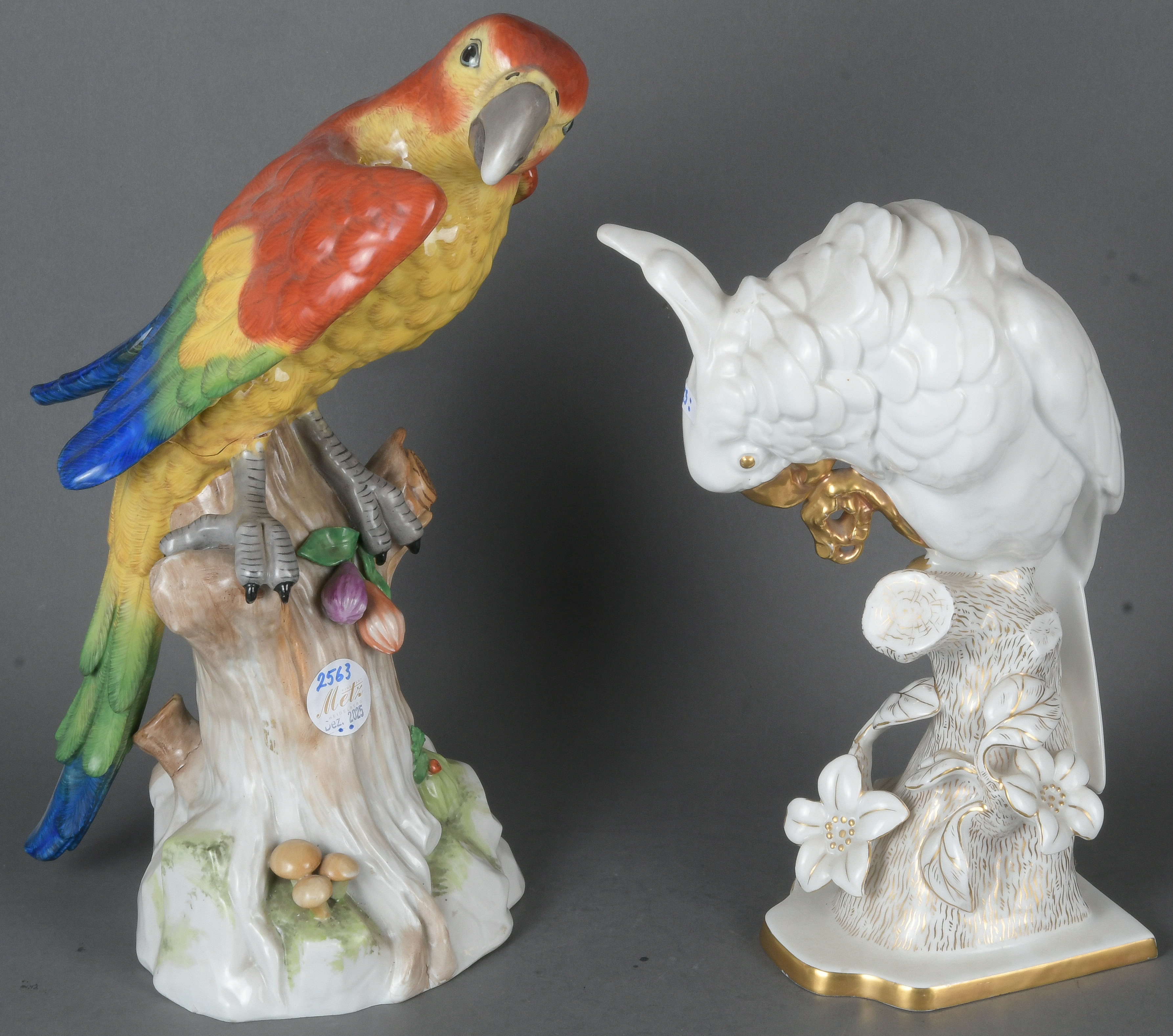 - Katalog-Nr: 2563Zwei Papageien auf Ast. Dresden / Hutschenreuther 20. Jh. Porzellan, bunt bemalt bzw. weiß glasiert und gold staffiert; am Boden gemarkt, H=31 / 38 cm. (einer besch.)o.L.