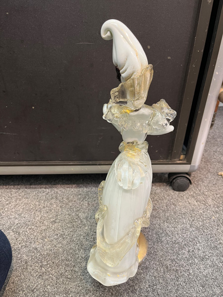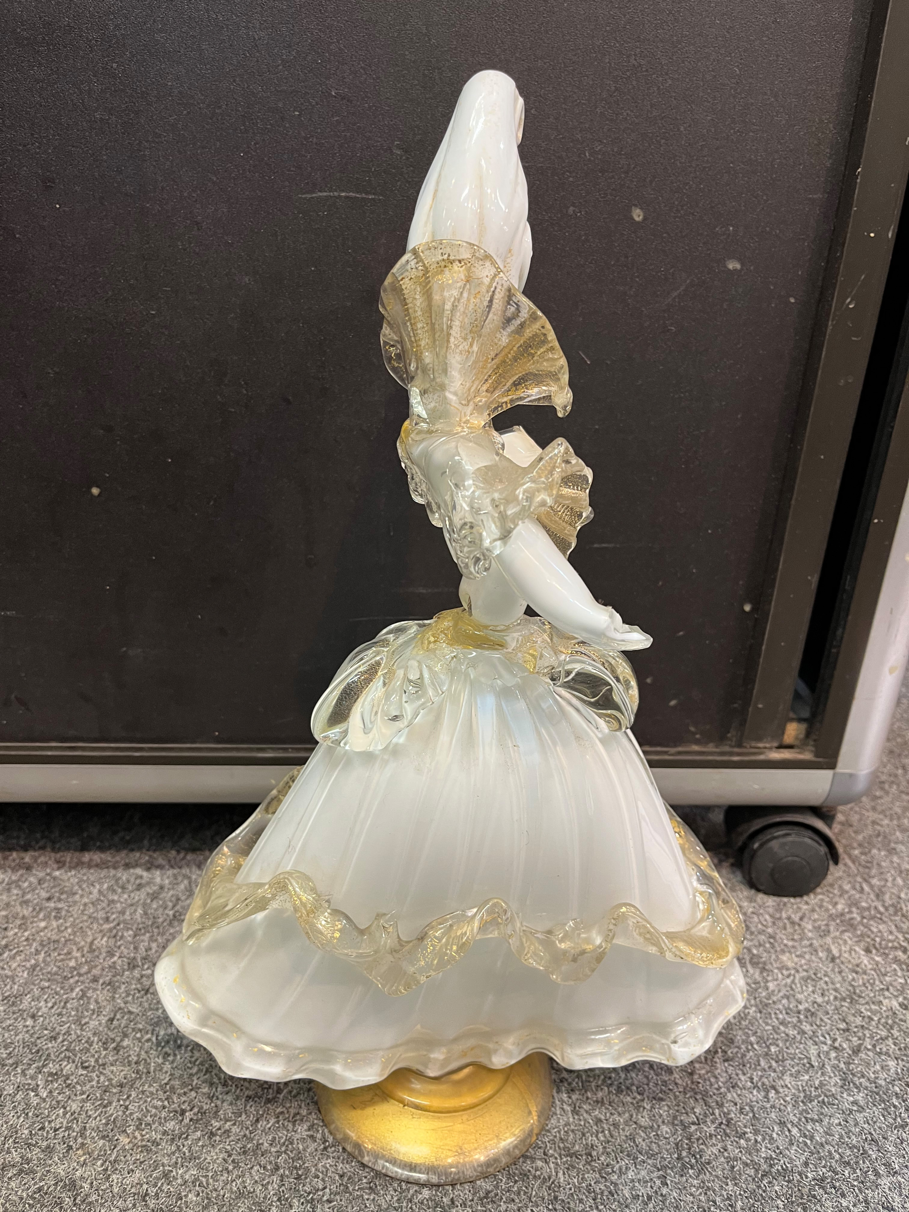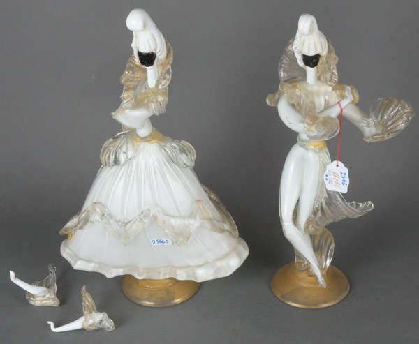- Katalog-Nr: 2566„Rara Coppia di Ballerini Mascherati“. Murano, Cesare Toso 20. Jh. Milchglas mit Goldpulvereinschmelzung, H=37,5 / 38 cm. (besch.)o.L.