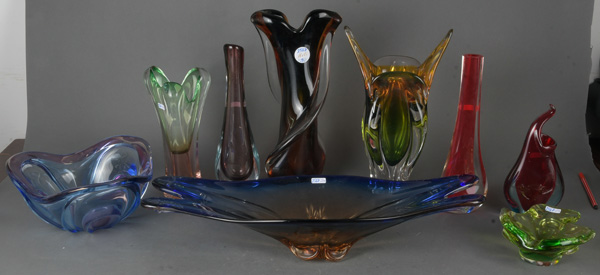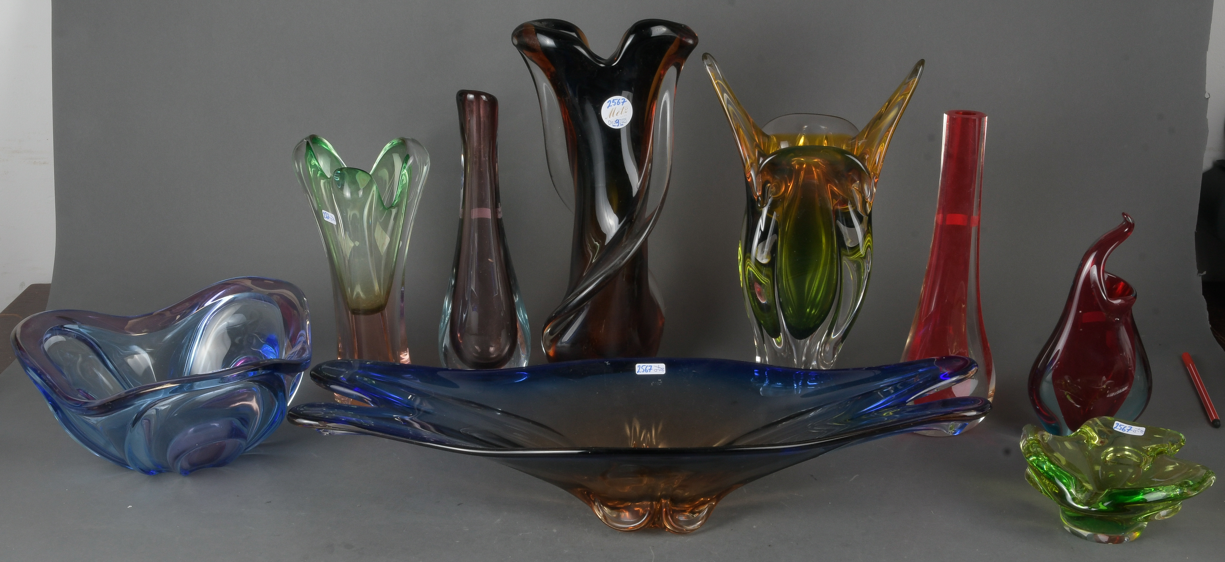 - Katalog-Nr: 2567Drei Schalen und sechs Vasen. Czechoslvakisches Glas 1950er/60er Jahre. Farbloses Glas, farbig überfangen, H=6 bis 35 cm.o.L.