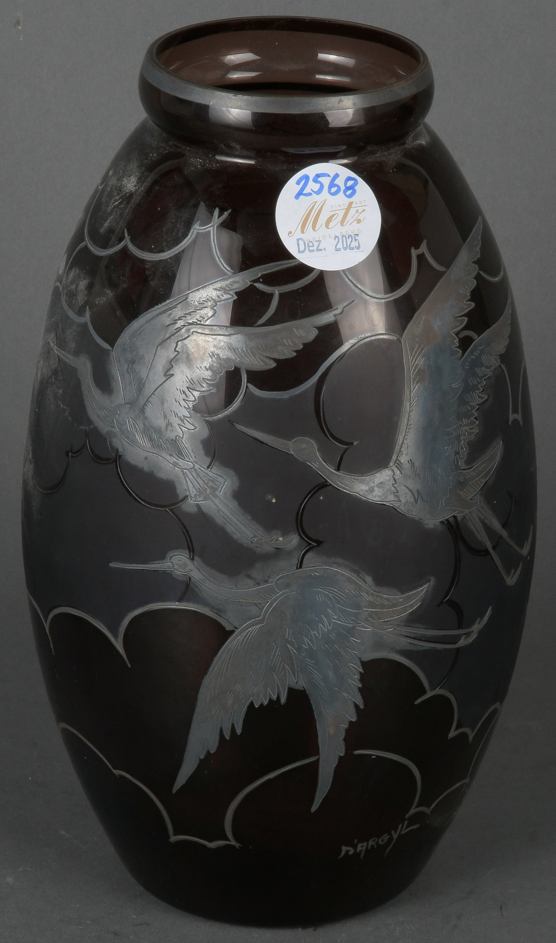 - Katalog-Nr: 2568Vase. Paris, D' Argyl 20. Jh. Farbloses Glas mit Silberauflage, auf der Wandung Ätzsignatur, H=26 cm.o.L.