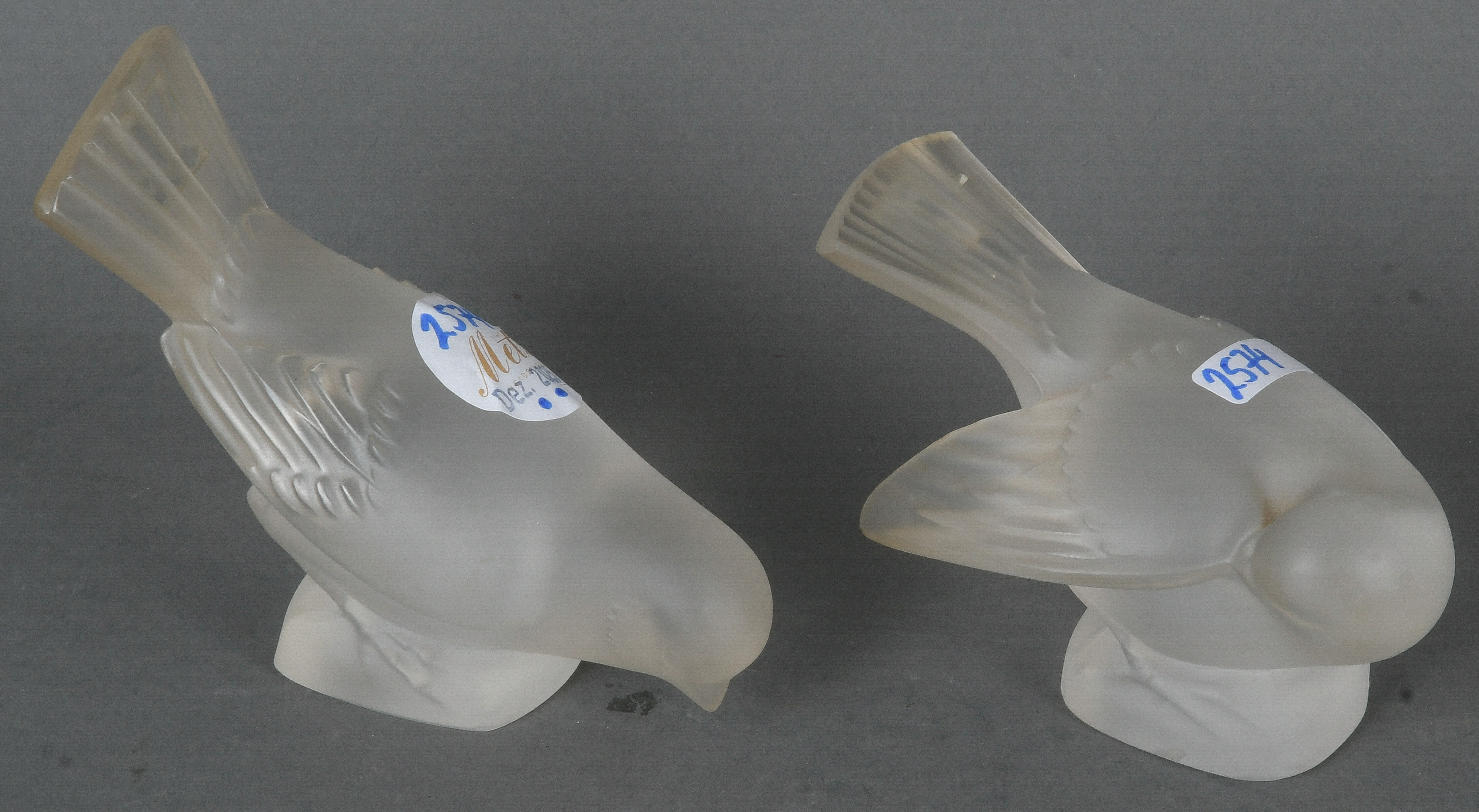 - Katalog-Nr: 2574Zwei Vögel. Frankreich, Lalique 20. Jh. Farbloses Glas, mattiert; am Boden gemarkt, H=8 / 10,5 cm. (best.)o.L.