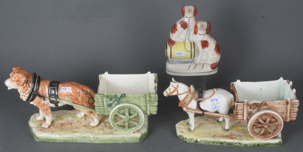 - Katalog-Nr: 2558Hund, Pferd mit Karren und Hundepaar. Deutsch 20. Jh. Feinsteinzeug, bunt bemalt, H=17 bis 19 cm.o.L.