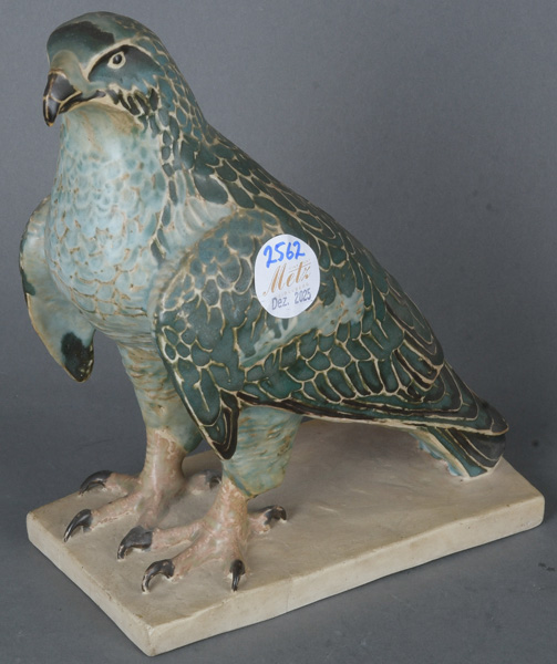 - Katalog-Nr: 2562Greifvogel. Bing & Grøndahl 20. Jh. Keramik, bunt bemalt; am Boden gemarkt und monogr. „MB“ für Mogen Bøgild, H=24 cm.o.L.