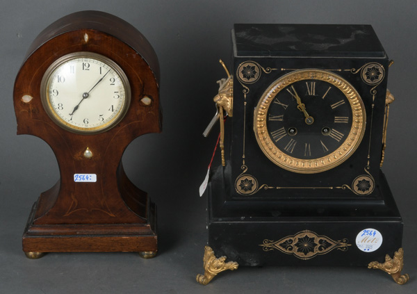 - Katalog-Nr: 2564Kaminuhr. Frankreich 19. Jh. Schwarzer Marmor mit vergoldeten Bronzebeschlägen; Uhrwerk mit doppeltem Schlüsselaufzug; dazu weitere Tischuhr mit Holzgehäuse, H=26,5 cm, B=22 cm, T=14 cm / H=28 cm, B=16 cm, T=8 cm. (Funktion ungeprüft)o.L.