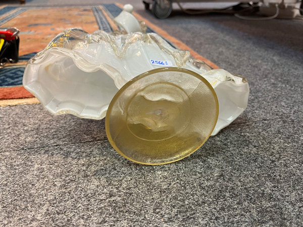 - Katalog-Nr: 2571Fünftlgs. Konvolut Glas. Deutsch, u.a. WMF / Murano 20. Jh. Farbig überfangen, teilw. lüstrierend bzw. mit Aufschmelzungen. Bestehend aus: Drei Schalen und zwei Vasen, H=10 bis 19 cm / D=8 bis 22 cm. (eine besch.)o.L.