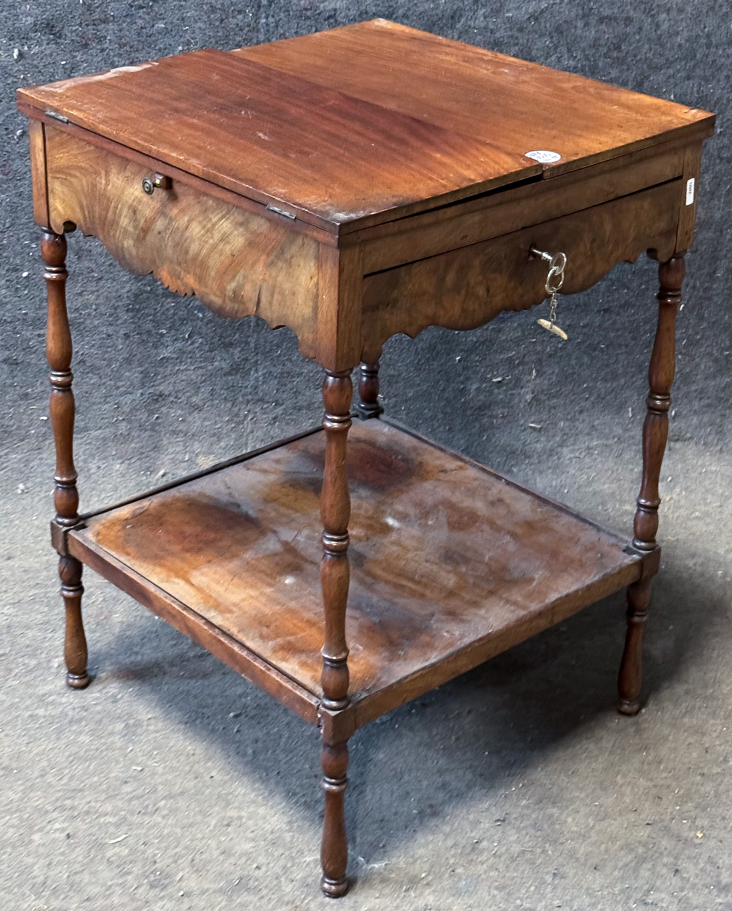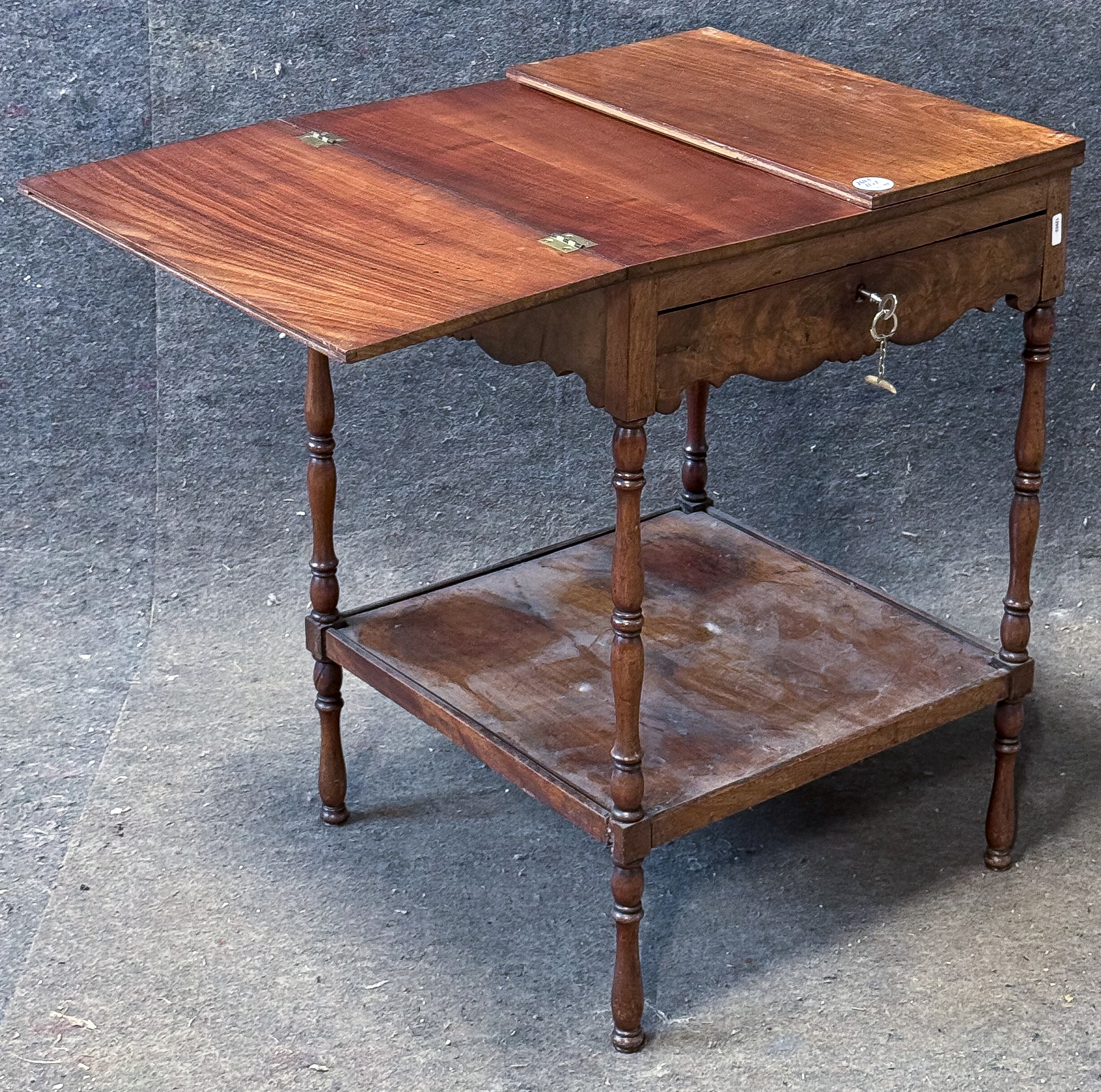 - Katalog-Nr: 2641Beistelltisch. Norddeutsch 19. Jh. Mahagoni furniert, teilw. massiv; gedrechselte Beine mit Mittelbrett, einschübiger Tischkasten, Platte beidseitig aufklappbar, H=68 cm, B=46 / 93 cm, T=46 cm.o.L.