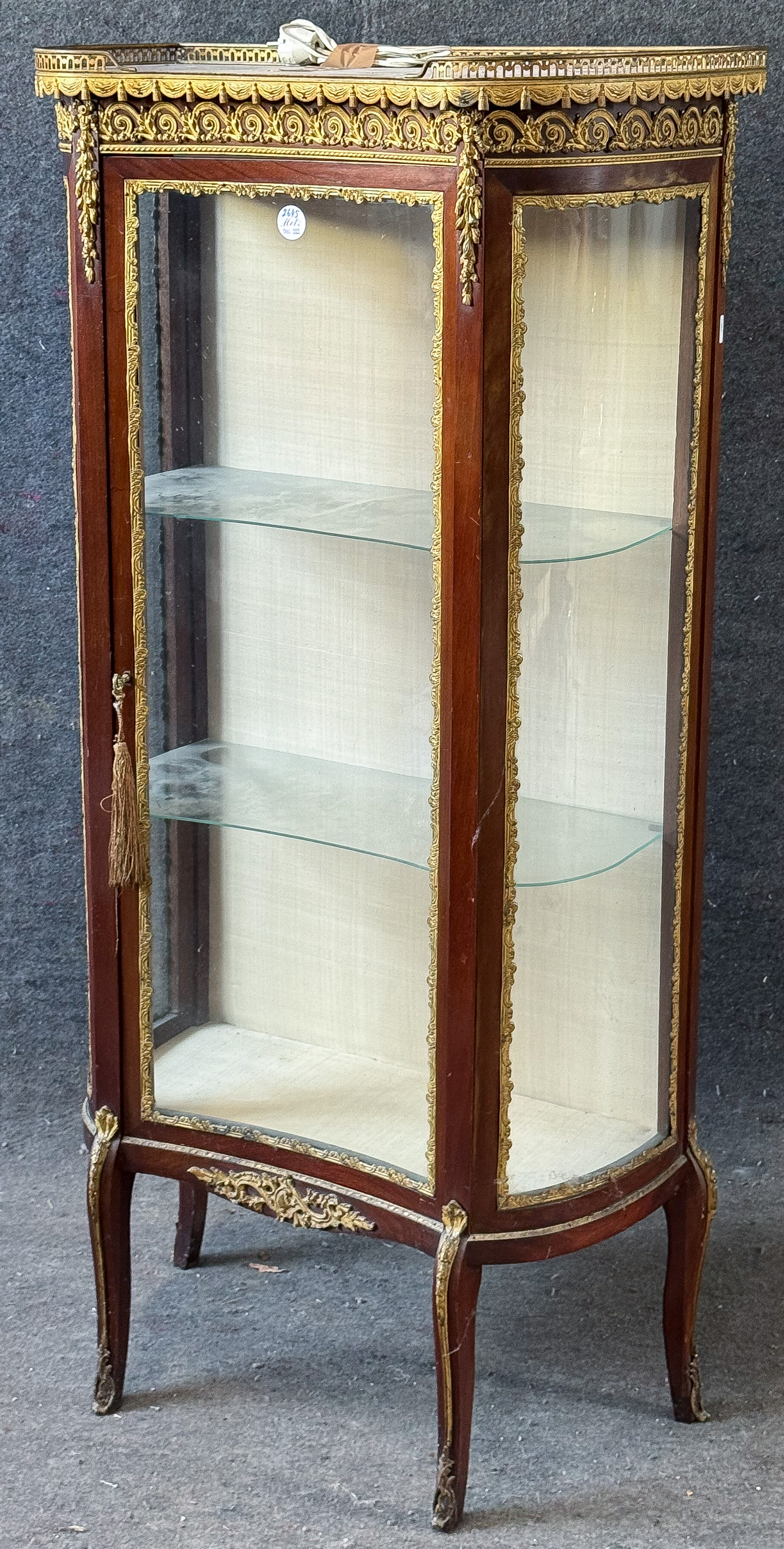 - Katalog-Nr: 2645Vitrine im Louis XVI-Stil. Frankreich 20. Jh. Mahagoni furniert, mit Bronzezierbeschlägen; Säbelbeine, eintürig mit halbrunden Seiten, dreiseitig verglast, überstehende Platte mit durchbrochener Galerie, H=139 cm, B=68 cm, T=34 cm. >>> Diese Los Nr. kann am MI, 17.12.25 (10.00 h bis 12.00 h) und SA, 20.12.25 (13.00 h bis 14.00 h) in unserem Depot Mannheim abgeholt werden.o.L.
