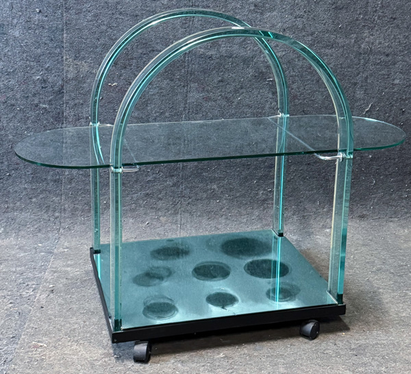 - Katalog-Nr: 2637Designer-Barrolltisch. Italien, Fiam 1980er Jahre. Glas / Metall, mit zwei Ablagen, auf Rollen, H=83,5 cm, B=112 cm, T=51 cm. >>> Diese Los Nr. kann am MI, 17.12.25 (10.00 h bis 12.00 h) und SA, 20.12.25 (13.00 h bis 14.00 h) in unserem Depot Mannheim abgeholt werden.o.L.
