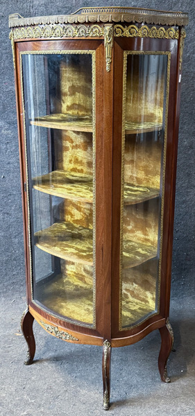 - Katalog-Nr: 2644Vitrine im Louis XVI-Stil. Frankreich 20. Jh. Mahgoni furniert, mit Bronzezierbeschlägen; geschweifte Füße, eintürig, halbrund und dreiseitig verglast, leicht überstehende Platte mit durchbrochener Galerie, H=147 cm, B=66 cm, T=35 cm. >>> Diese Los Nr. kann am MI, 17.12.25 (10.00 h bis 12.00 h) und SA, 20.12.25 (13.00 h bis 14.00 h) in unserem Depot Mannheim abgeholt werden.o.L.