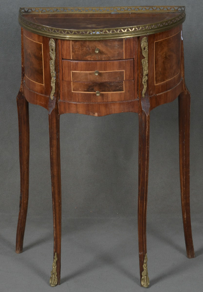 - Katalog-Nr: 2648Halbrunde Pfeilerkommode im Louis XIV-Stil. Italien 20. Jh. Nussbaum furniert mit Fadeneinlagen und Bronzebeschlägen; leicht gebogene Beine, dreischübig, überstehende Platte mit durchbrochener Galerie, H=72 cm, B=44 cm, T=25 cm.o.L.