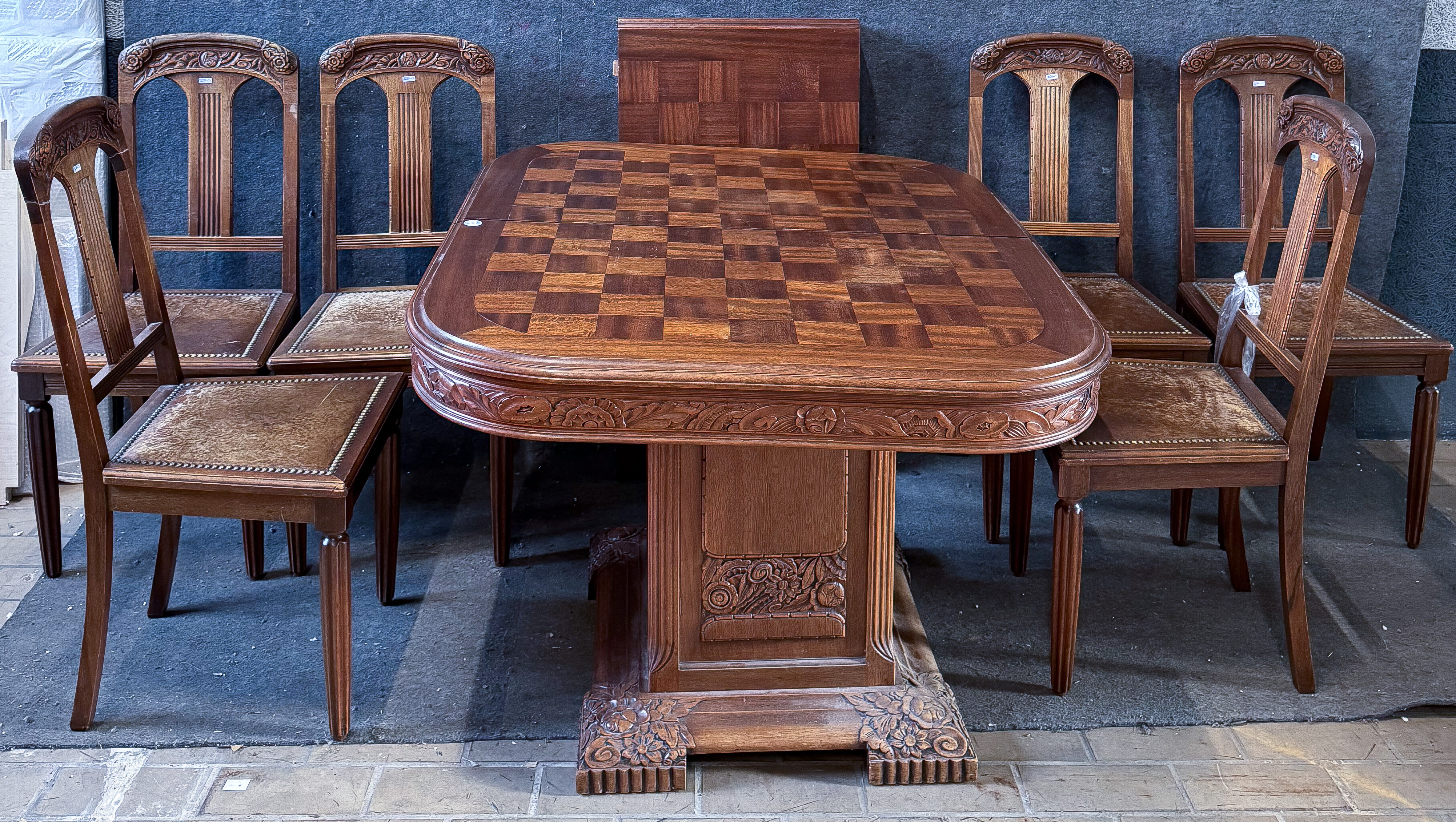 - Katalog-Nr: 2650Art Déco-Ausziehtisch mit sechs Stühlen. Deutsch 20. Jh. Massiv Eiche, teilw. geschnitzt mit Floraldekor und Noppen; profilierter Fuß, quadratische Mittelsäule, in Füllung gearbeitet, überstehende, an den Ecken abgerundete Platte mit Würfeldekor in Mahagoni furniert, mit einer Einlegeplatte, H=74m, B=127 / 181 cm, T=104 cm; die Stühle zum Tisch passend. >>> Diese Los Nr. kann am MI, 17.12.25 (10.00 h bis 12.00 h) und SA, 20.12.25 (13.00 h bis 14.00 h) in unserem Depot Mannheim abgeholt werden.o.L.