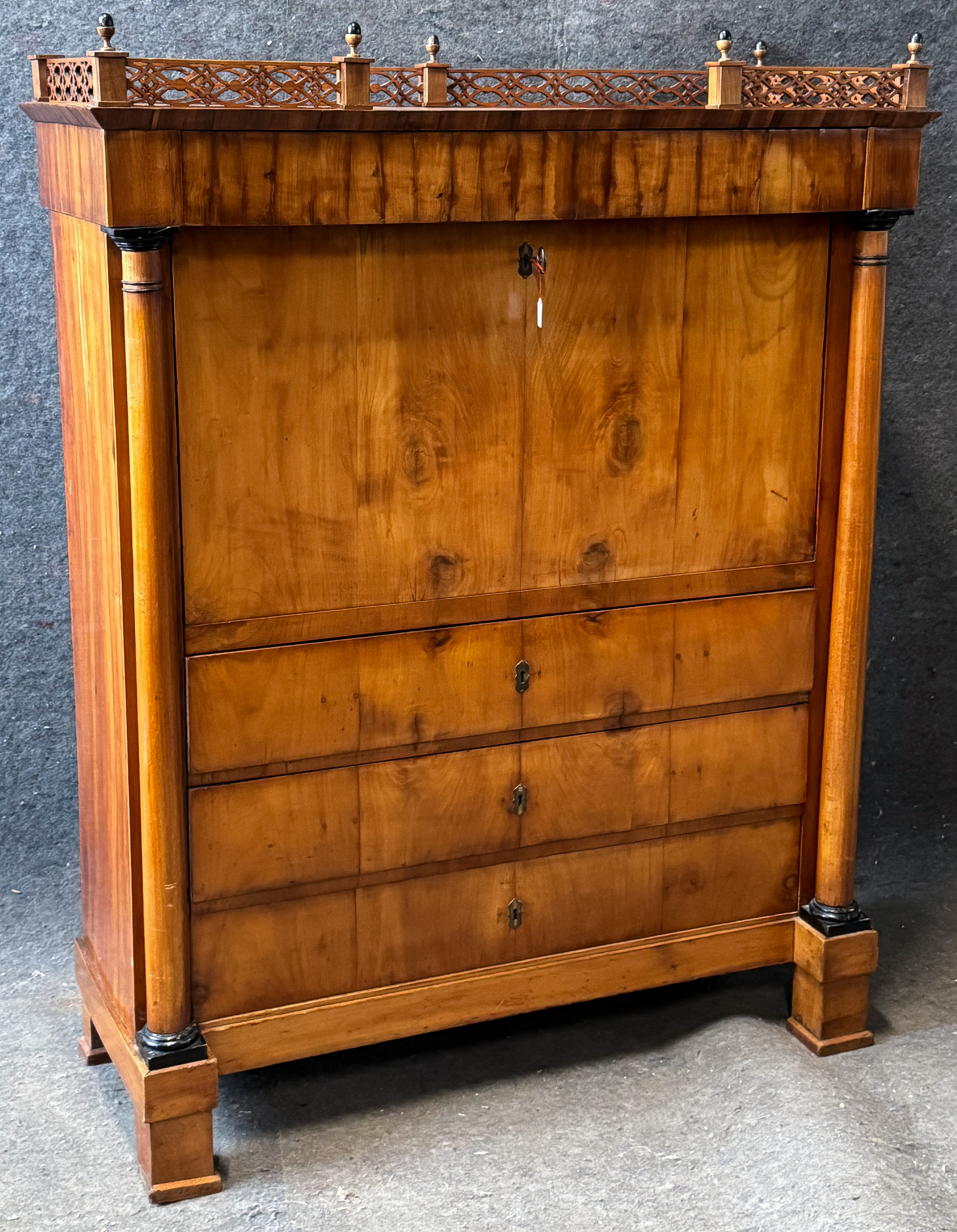 - Katalog-Nr: 2651Biedermeier-Standsekretär. Süddeutsch 19. Jh. Kirschbaum furniert, teilw. massiv und ebonisiert; Klotzfüße, gerader Sockel, vierschügig mit vorgesetzten Säulen, Schreibklappe mit aufwendiger Inneneinteilung, profilierte Platte mit durchbrochener Galerie, H=154 cm, B=121 cm, T=45 cm.o.L.