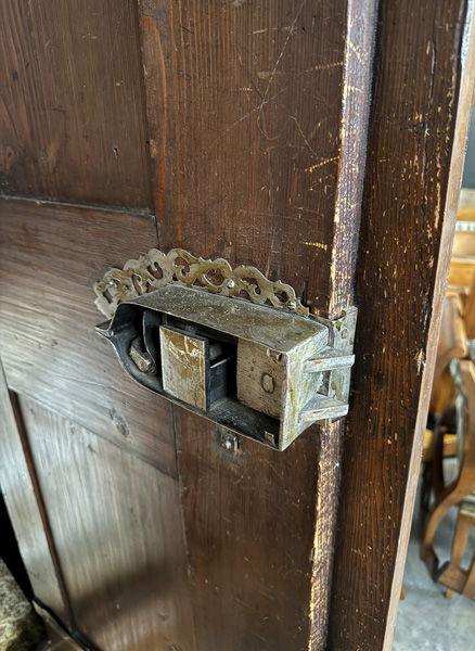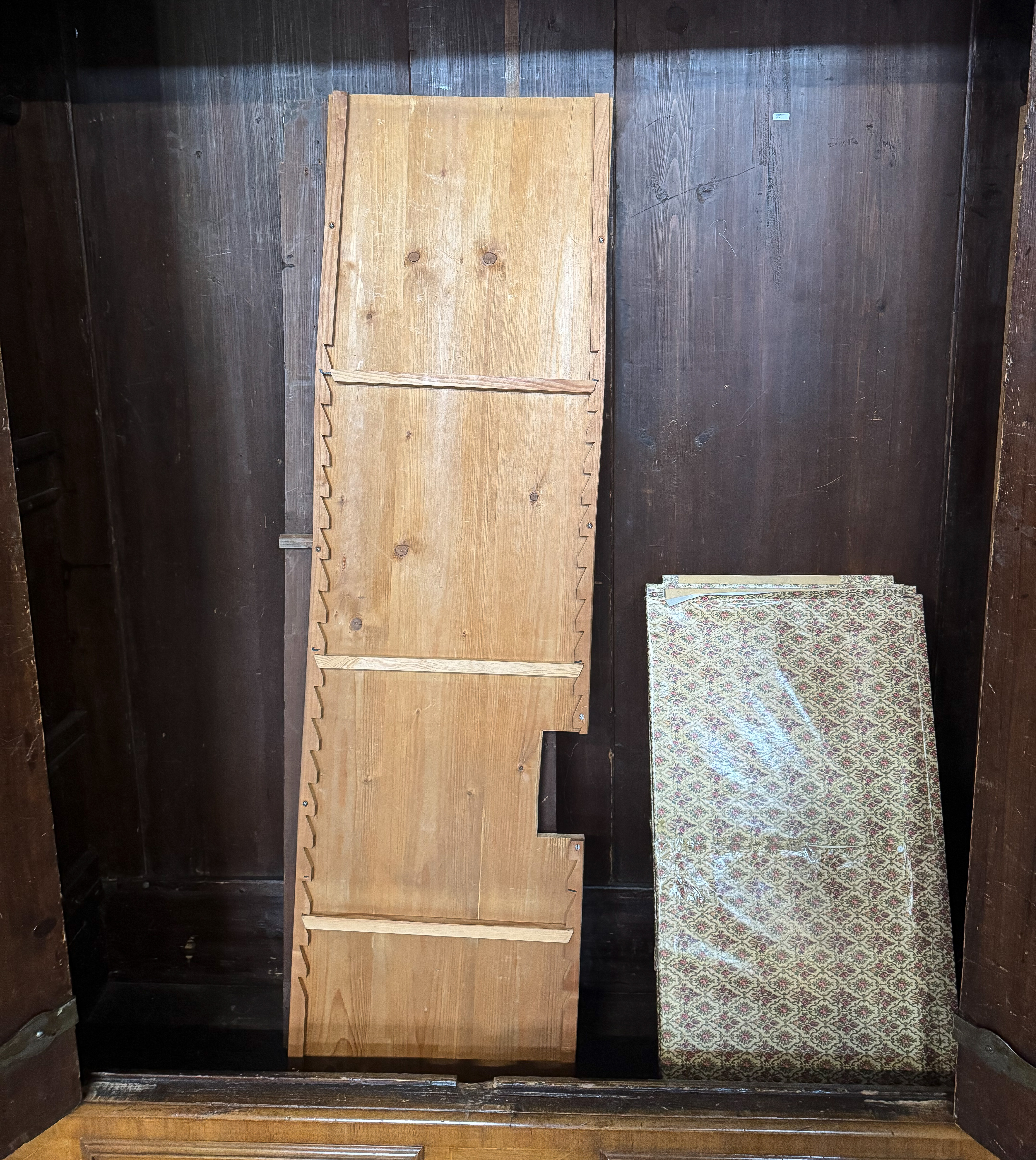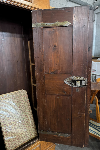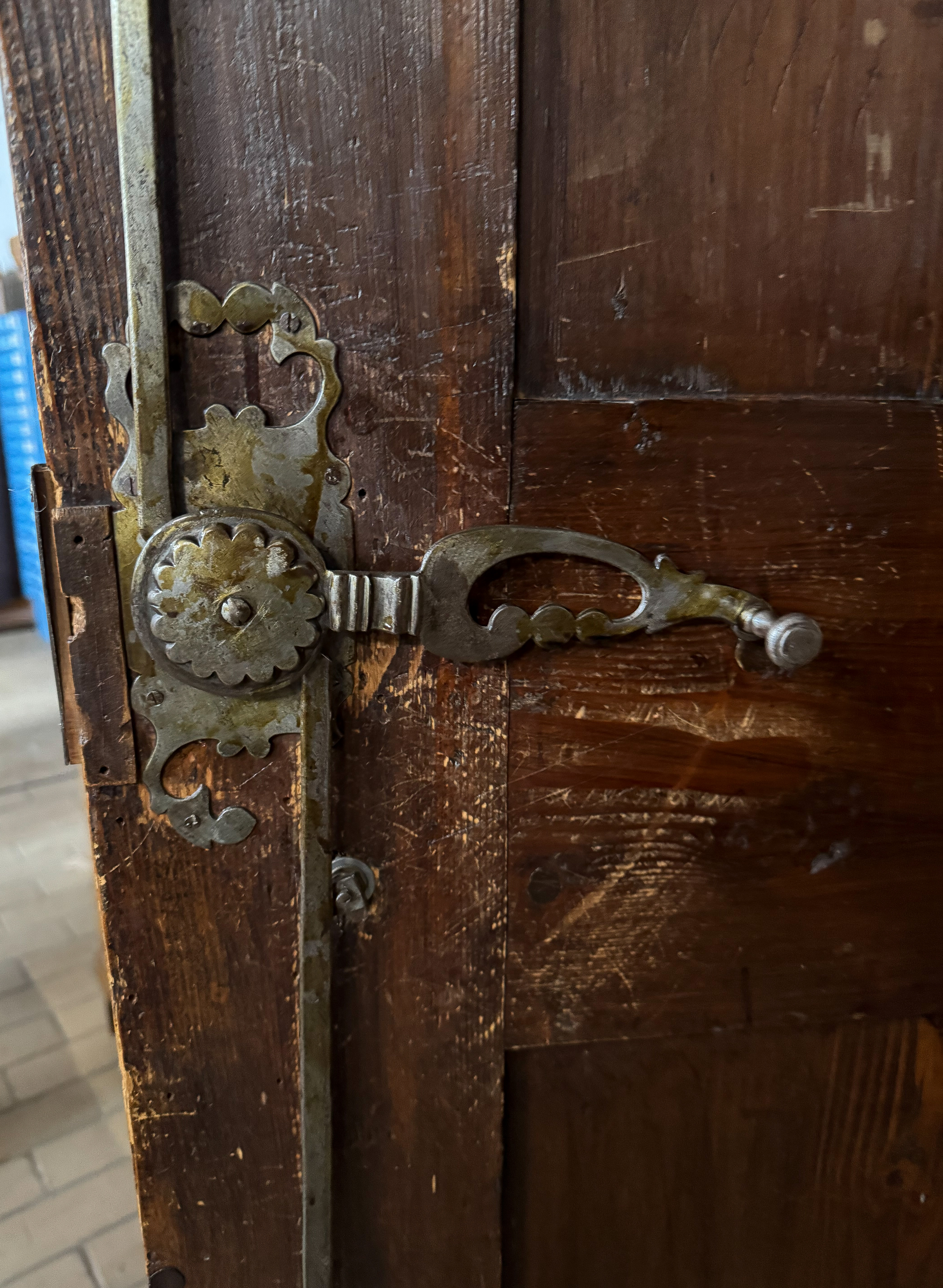- Katalog-Nr: 2652Barock-Schrank. Süddeutsch 18. Jh. Nussbaum furniert, teilw. massiv und intarsiert mit Sterndekor, aufwendiges Schloss mit Verriegelung, Messingbeschläge; ausgesägte Füße, profilierter Sockel, zweitürig mit aufgesetzten Füllungen, vorgeblendete Schlagleiste, profiliertes Gesims, H=228 cm, B=192 cm, T=65 cm.o.L.