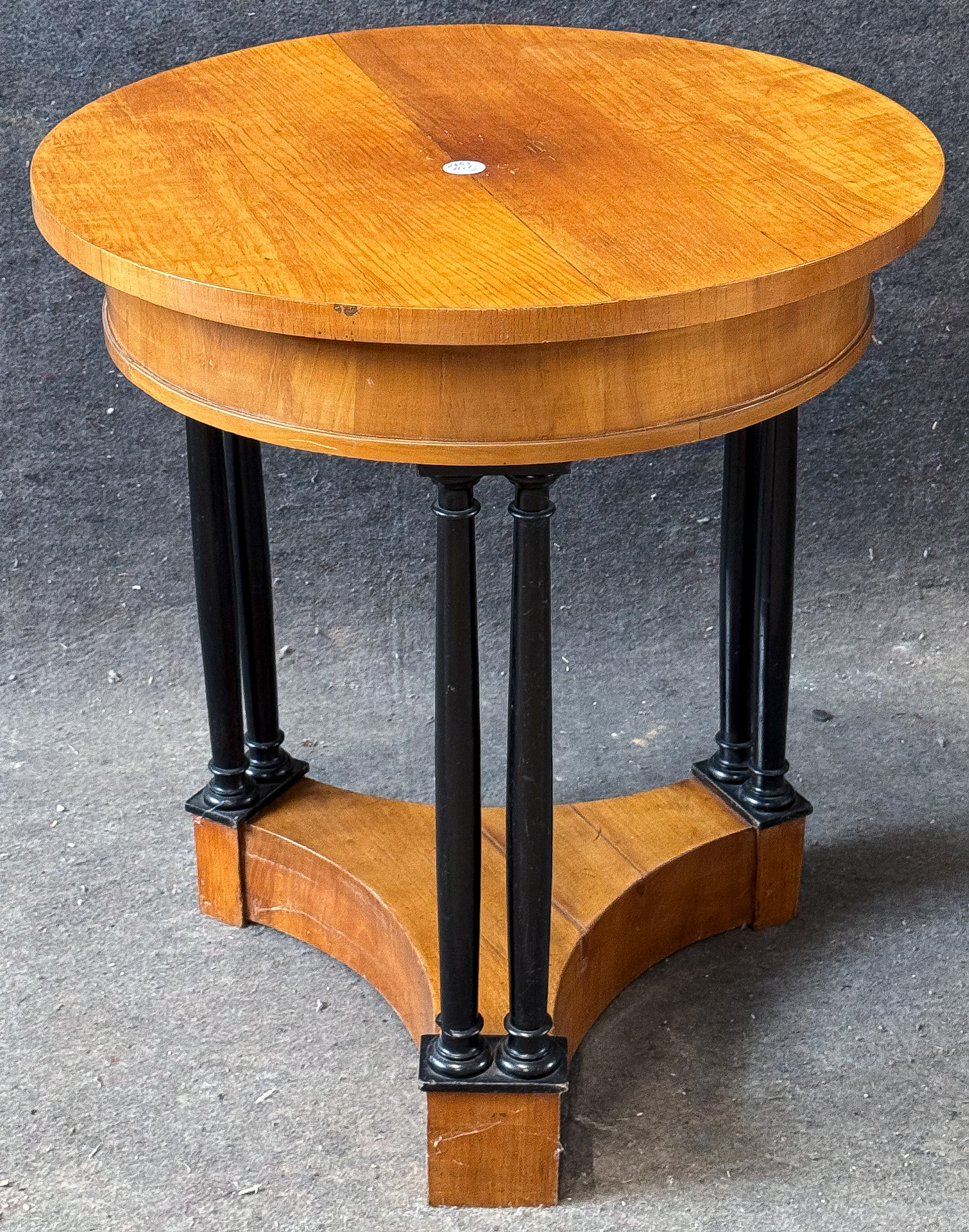- Katalog-Nr: 2653Runder Tisch im Biedermeier-Stil. Deutsch um 1900. Kirschbaum furniert, teilw. massiv und ebonisiert; dreipassiger Fuß mit sechs Säulen, überstehende Platte, H=75 cm, D=66 cm.o.L.