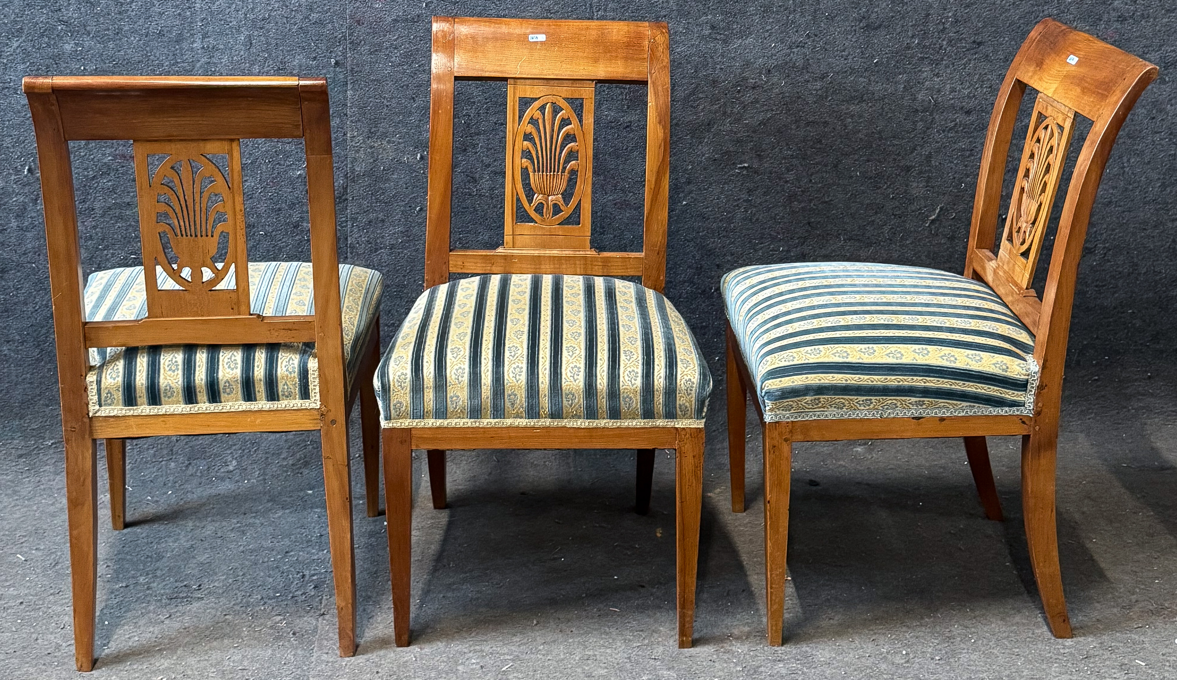 - Katalog-Nr: 2654Drei Biedermeier-Stühle. Deutsch 19. Jh. Massiv Kirschbaum; sich nach unten verjüngende Vierkant- und Säbelbeine, durchbrochene Rückenlehne mit Floraldekor, gepolsterte Sitzfläche.o.L.