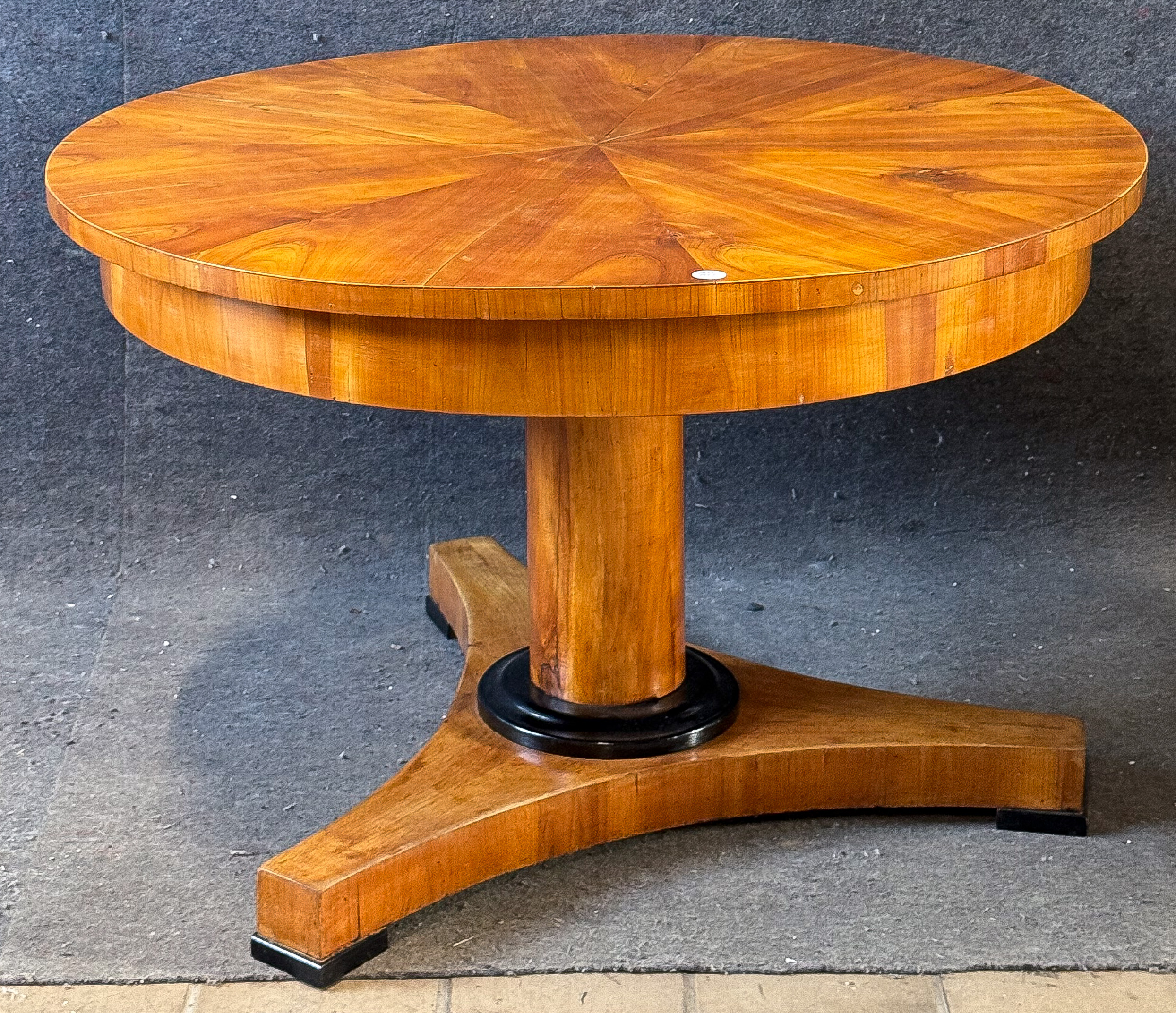 - Katalog-Nr: 2657Runder Biedermeier-Tisch. Deutsch 19. Jh. Kirschbaum furniert, teilw. massiv und ebonisiert; dreipassiger Fuß, Mittelsäule, überstehende Platte, H=78 cm, D=118 cm. >>> Diese Los Nr. kann am MI, 17.12.25 (10.00 h bis 12.00 h) und SA, 20.12.25 (13.00 h bis 14.00 h) in unserem Depot Mannheim abgeholt werden.o.L.