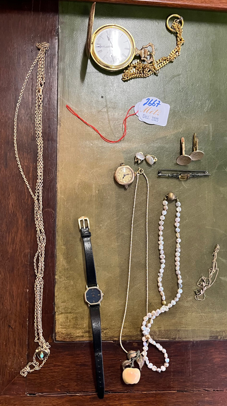 - Katalog-Nr: 2667Zehntlgs. Konvolut Schmuck. Meist Silber, teilw. vergoldet. Bestehend aus: Eine Herrentaschenuhr mit Kette, ein Paar Manschettenknöpfe, ein Paar Ohrclips, eine Brosche, Halsketten und eine Armbanduhr „Eterna“. (Funktion ungeprüft)o.L.