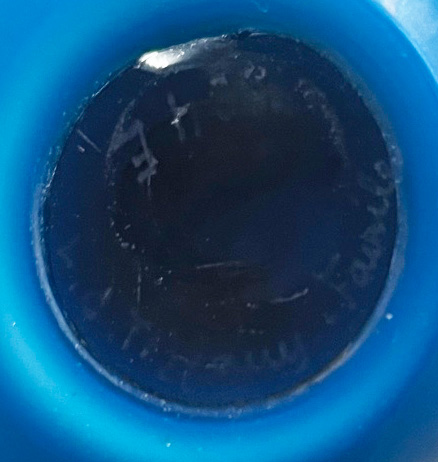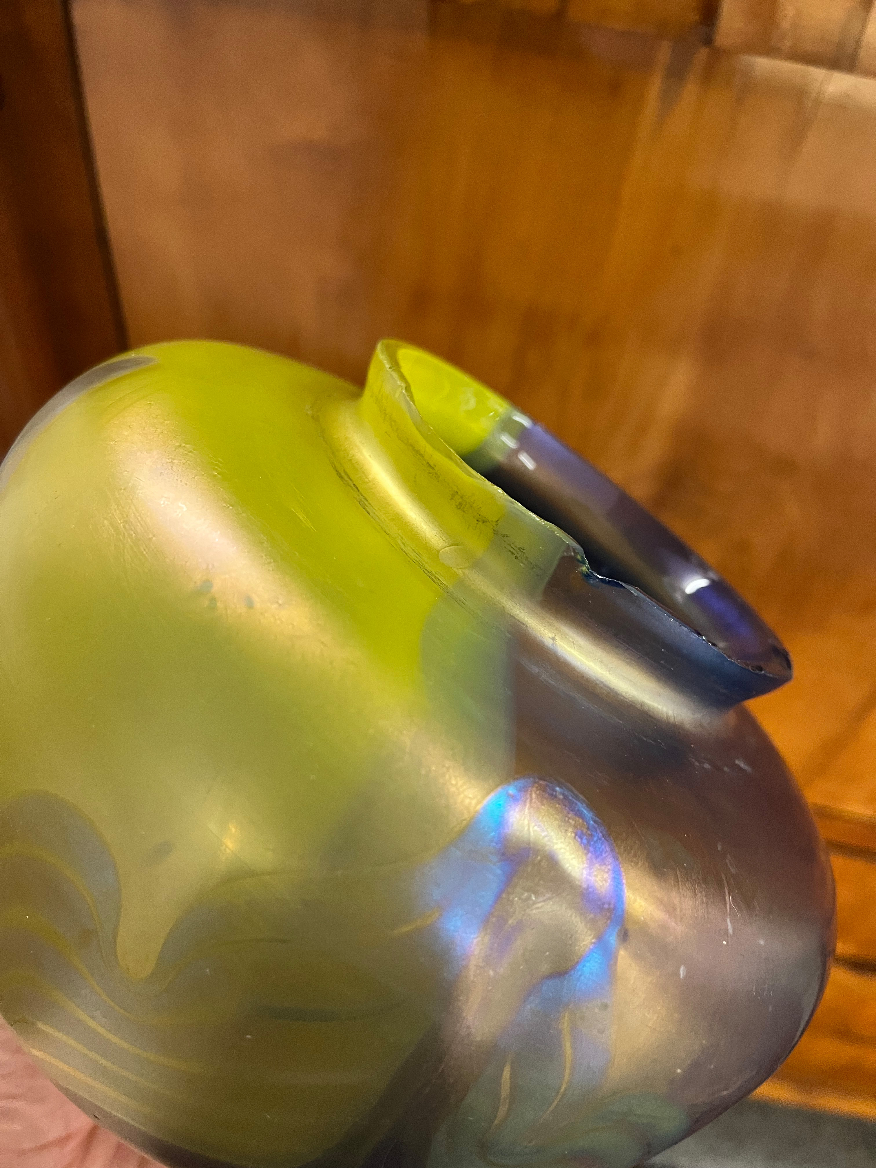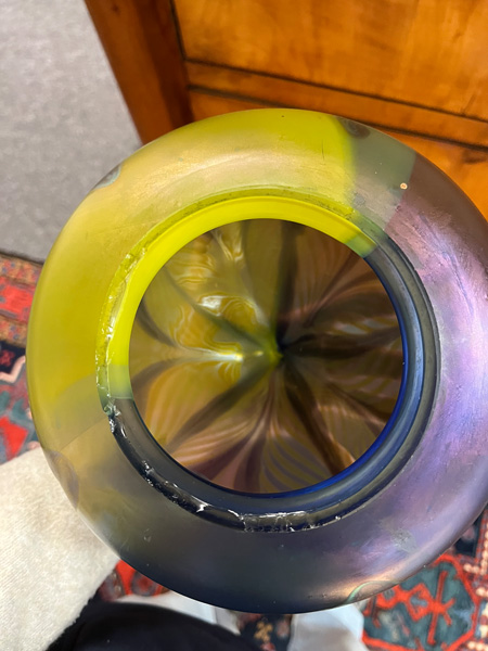 - Katalog-Nr: 2669Vase. USA, Louis Comfort Tiffany 20. Jh. Farbloses Glas, blau verlaufend überfangen; am Boden Ätzsignatur, H=14 cm.o.L.