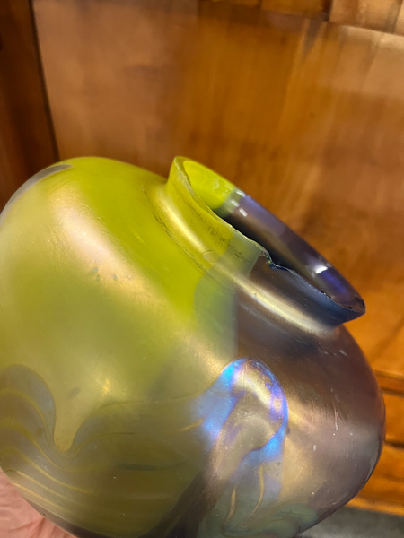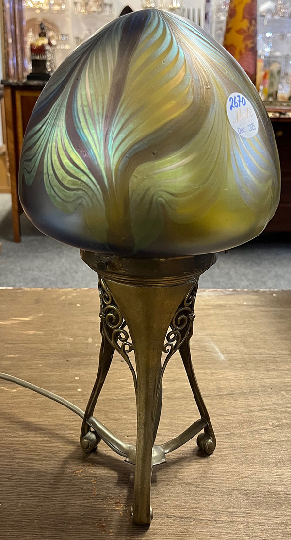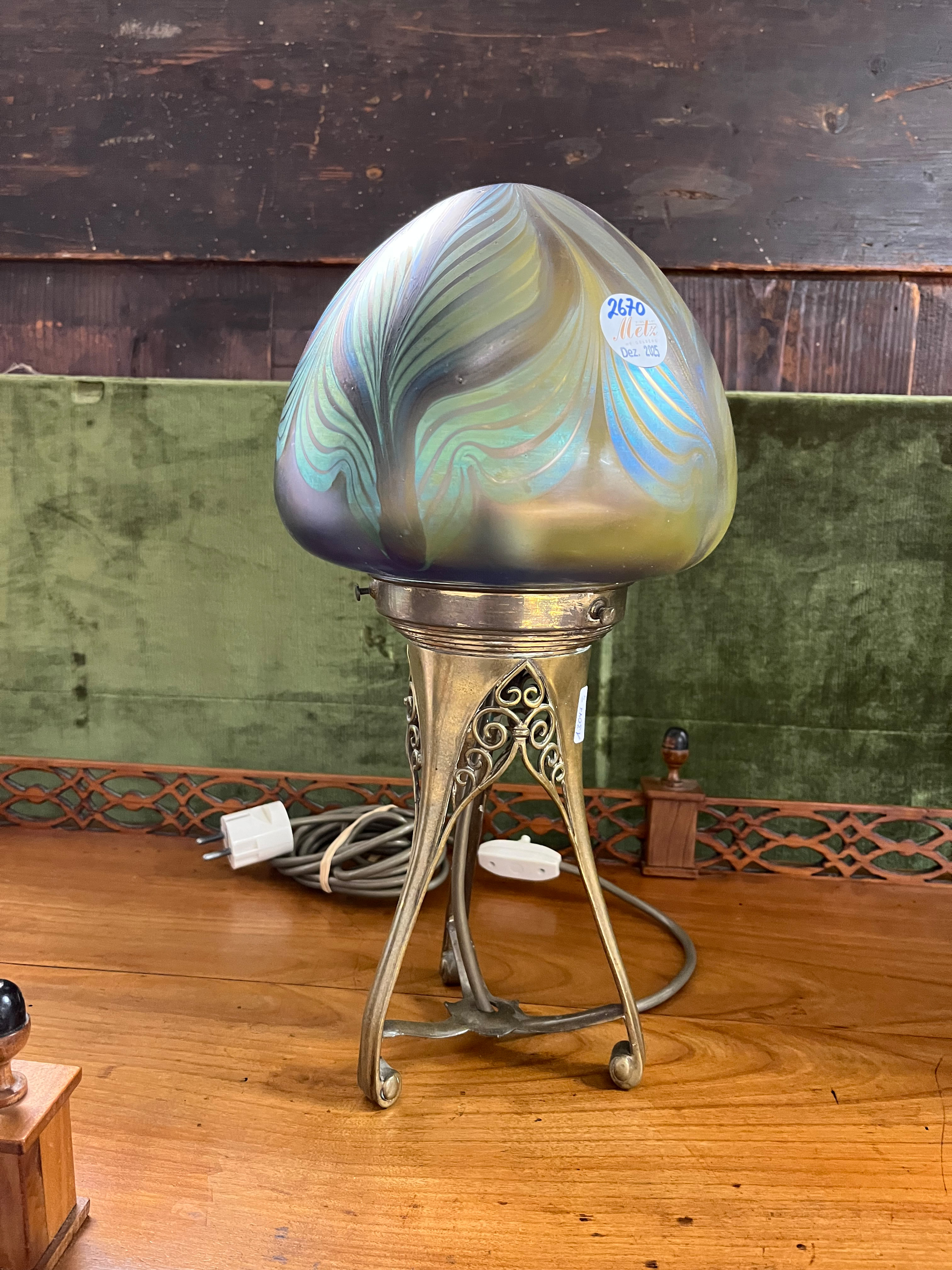 - Katalog-Nr: 2670Jugendstil-Lampe. Austria, WW Loetz um 1900. Dreipassiger, hoher Messingfuß mit pilzförmigem Glasschirm, farbig überfangen mit lüstrierend gekämmtem Dekor, H=41 cm, D=20 cm. (Rand min. best. / Funktion ungeprüft)o.L.