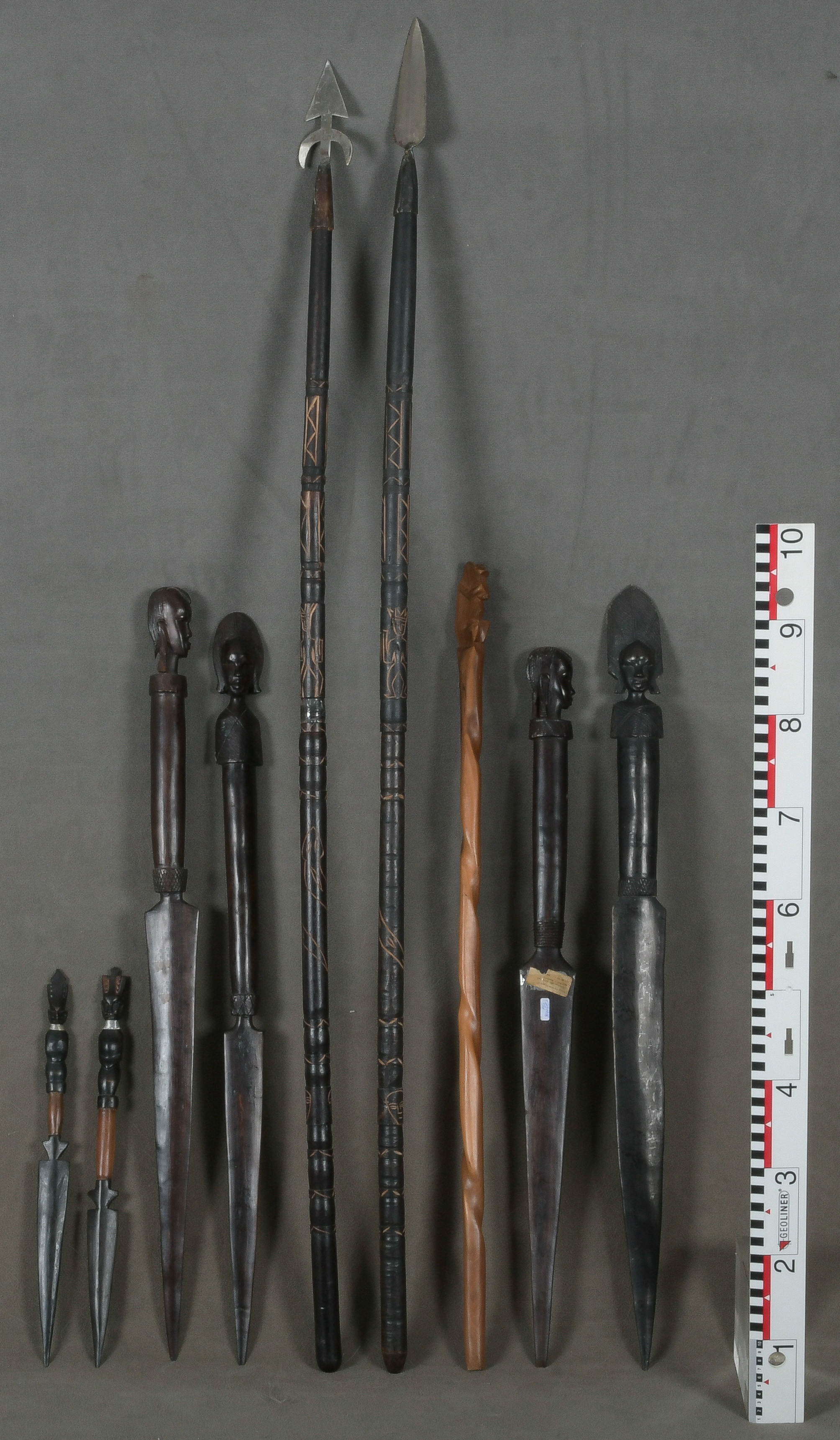 - Katalog-Nr: 2672Konvolut Afrikana, u.a. Gehstöcke, Speere und Zeremonialstäbe. Massivholz, teilw. geschnitzt, L=47 bis 156 cm. (ein Teil besch.) Provenienz: Erworben bei Dr. Max Mohl Kunsthandel, Bammental.o.L.