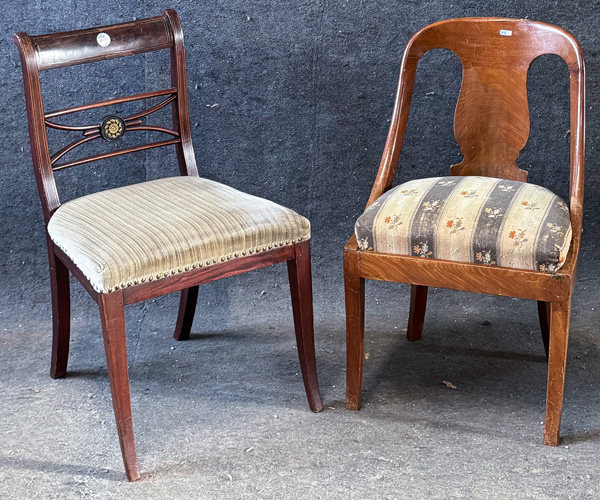 - Katalog-Nr: 2656Zwei Biedermeier-Stühle. Norddeutsch 19. Jh. Mahagoni furniert mit Fadeneinlagen, teilw. massiv; Säbelbeine, durchbrochener bzw. halbrunder Rücken.o.L.