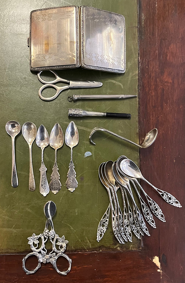 - Katalog-Nr: 2668Konvolut Silber, ca. 200 g. Bestehend aus: Drei kleine Löffel, elf und drei Mokkalöffel, eine Traubenschere, eine Schere, eine Zigarettenspitze und ein Kugelschreiber.o.L.