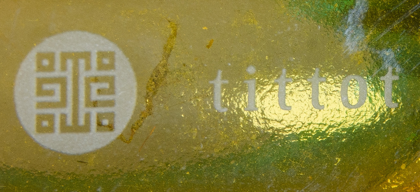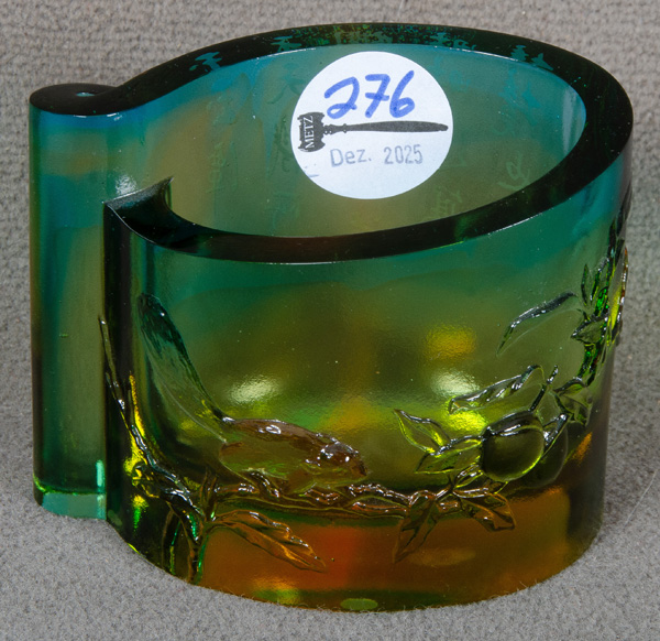 - Katalog-Nr: 276Vase. China, Tittot. Dickwandiges Glas mit erhabenen Eichhörnchen- und Kirschblütendekor, rückseitig gravierte chinesische Schriftzeichen, H=9,2 cm.o.L.