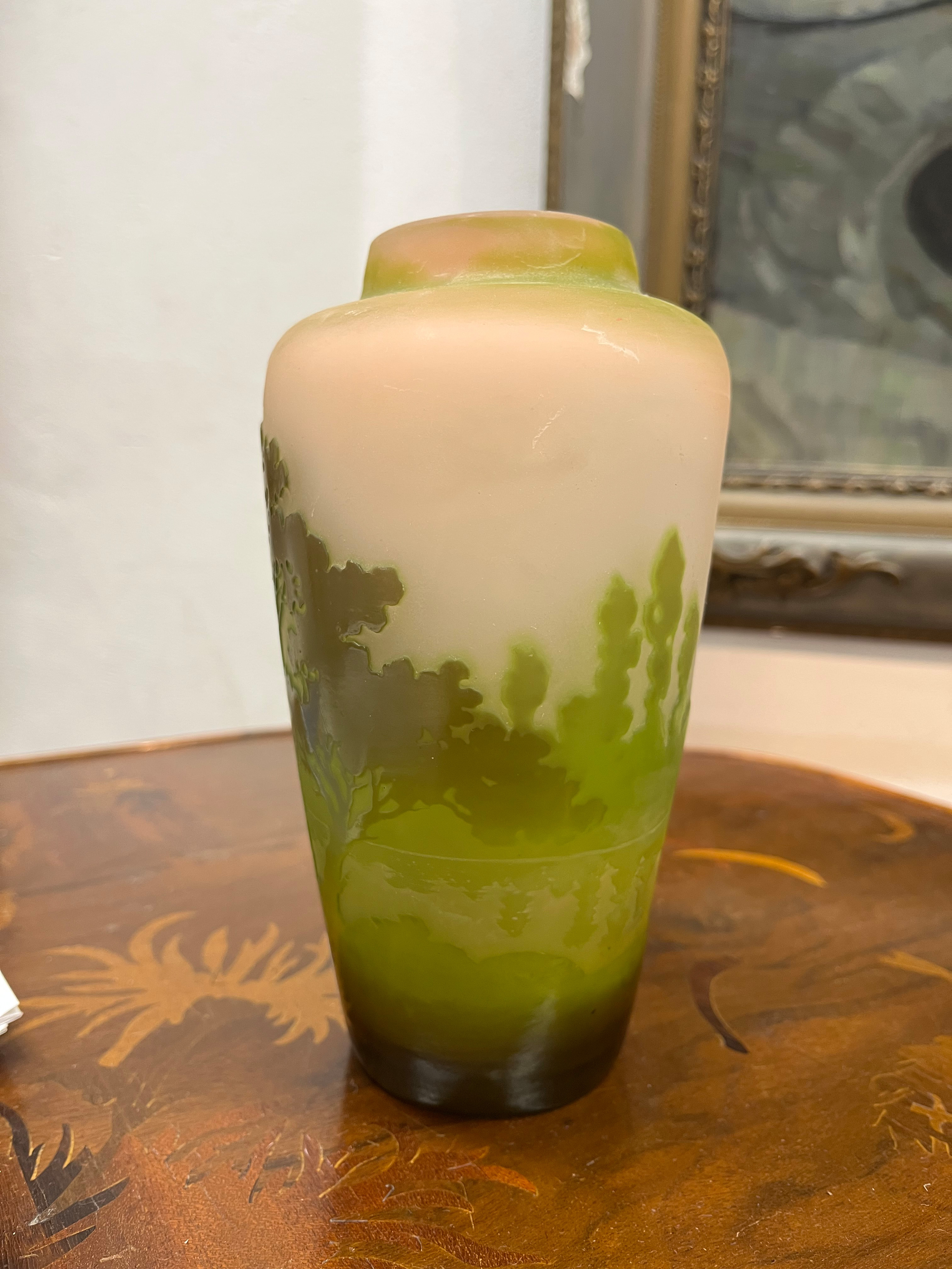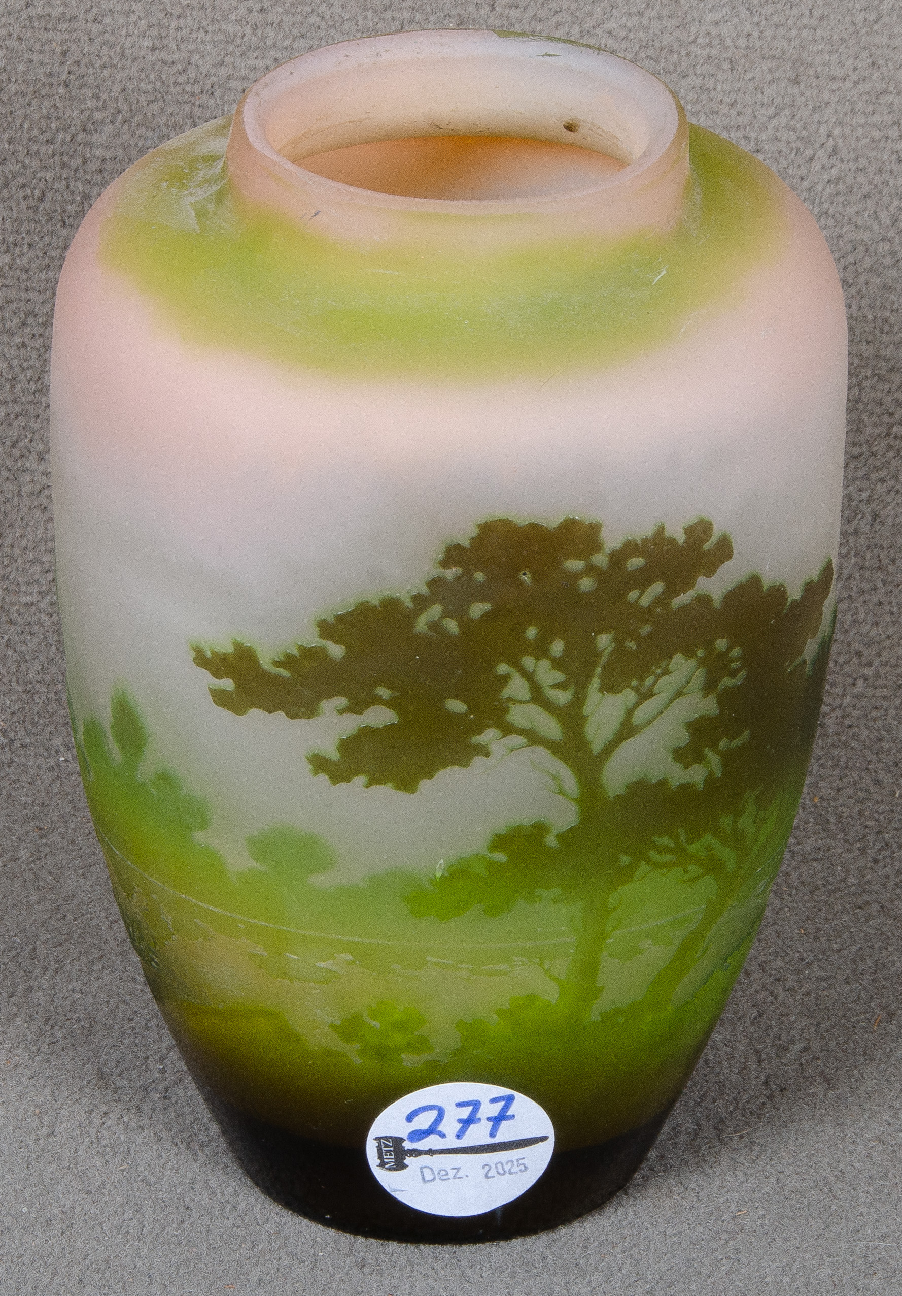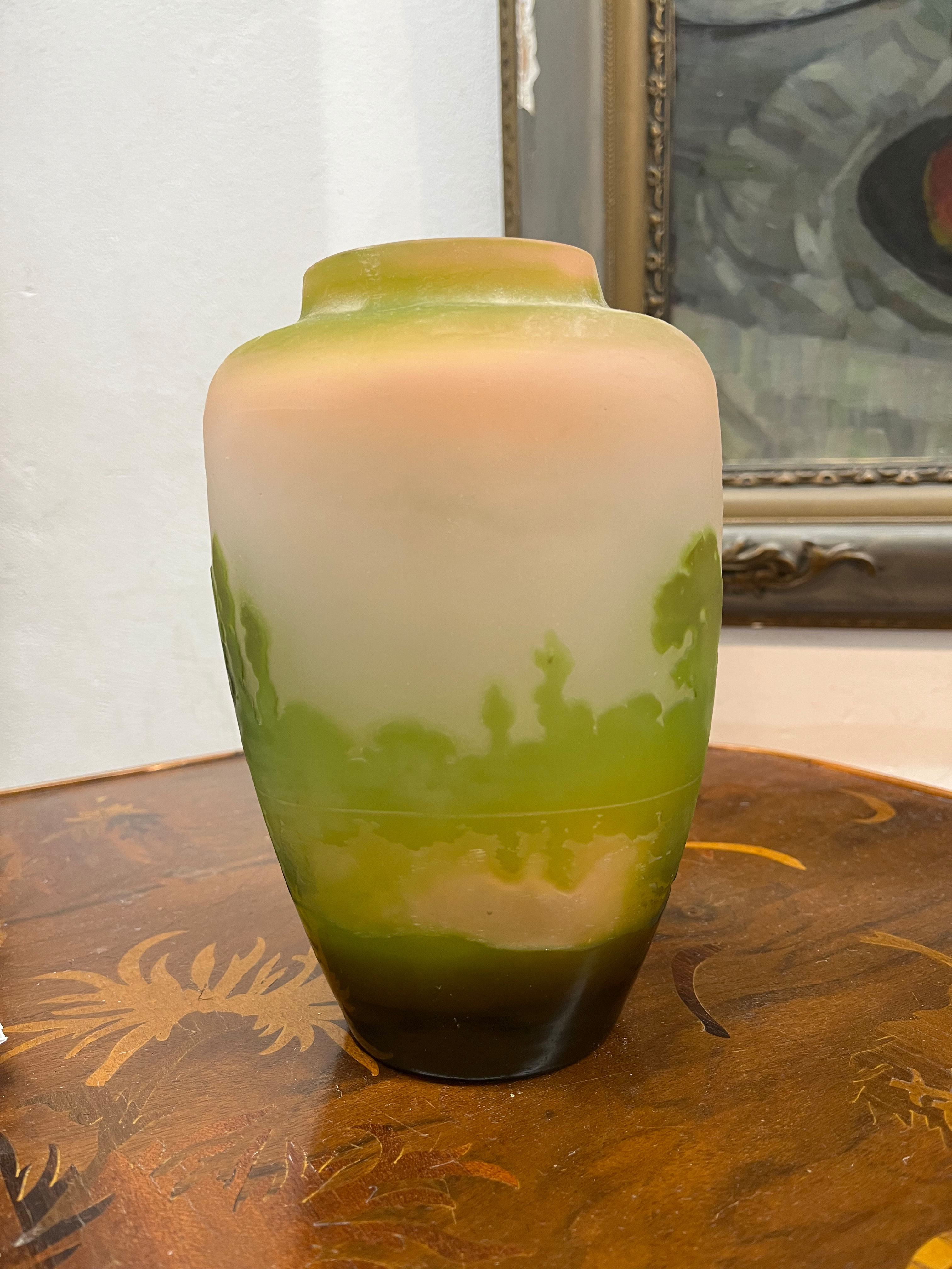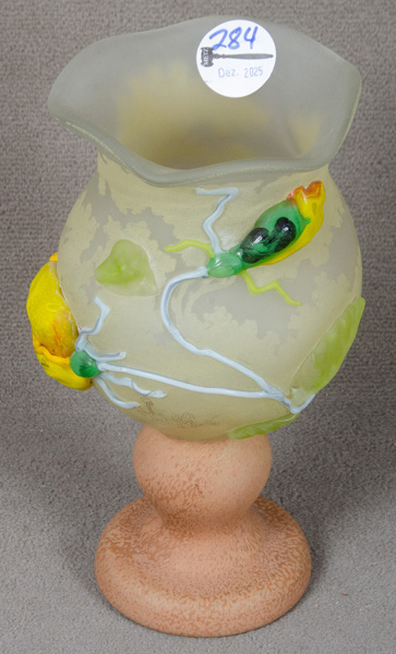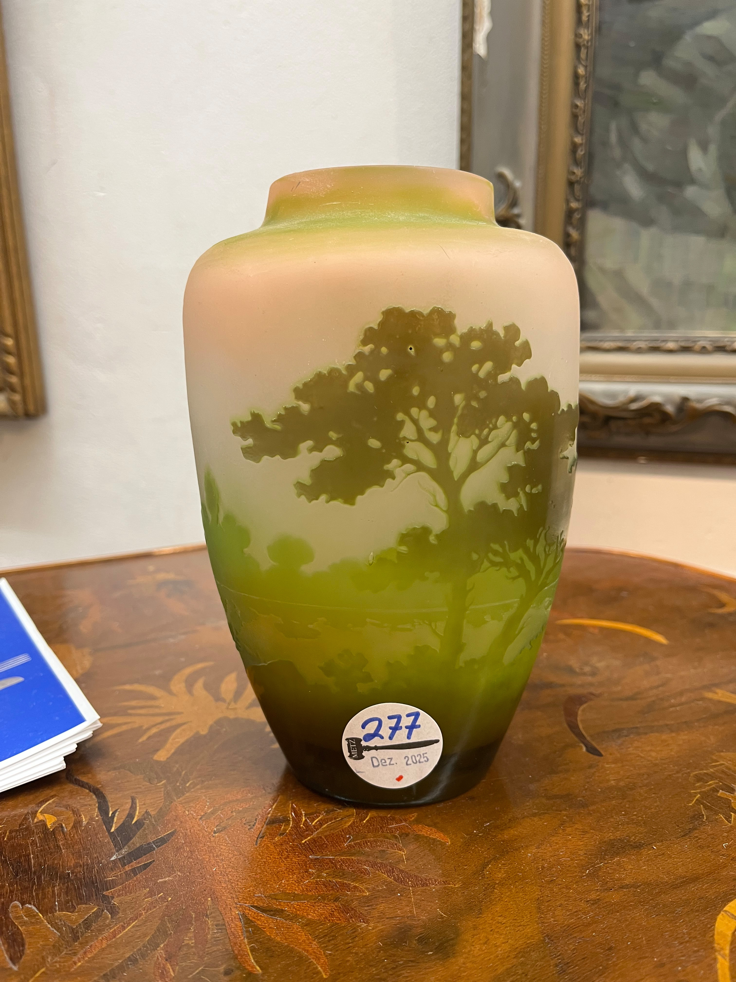 - Katalog-Nr: 277Jugendstil-Vase. Nancy, Émile Gallé um 1900. Farbloses Glas, farbig überfangen, umlaufend mit Uferlandschaft geschnitten; an der Wandung sign., H=16 cm.o.L.
