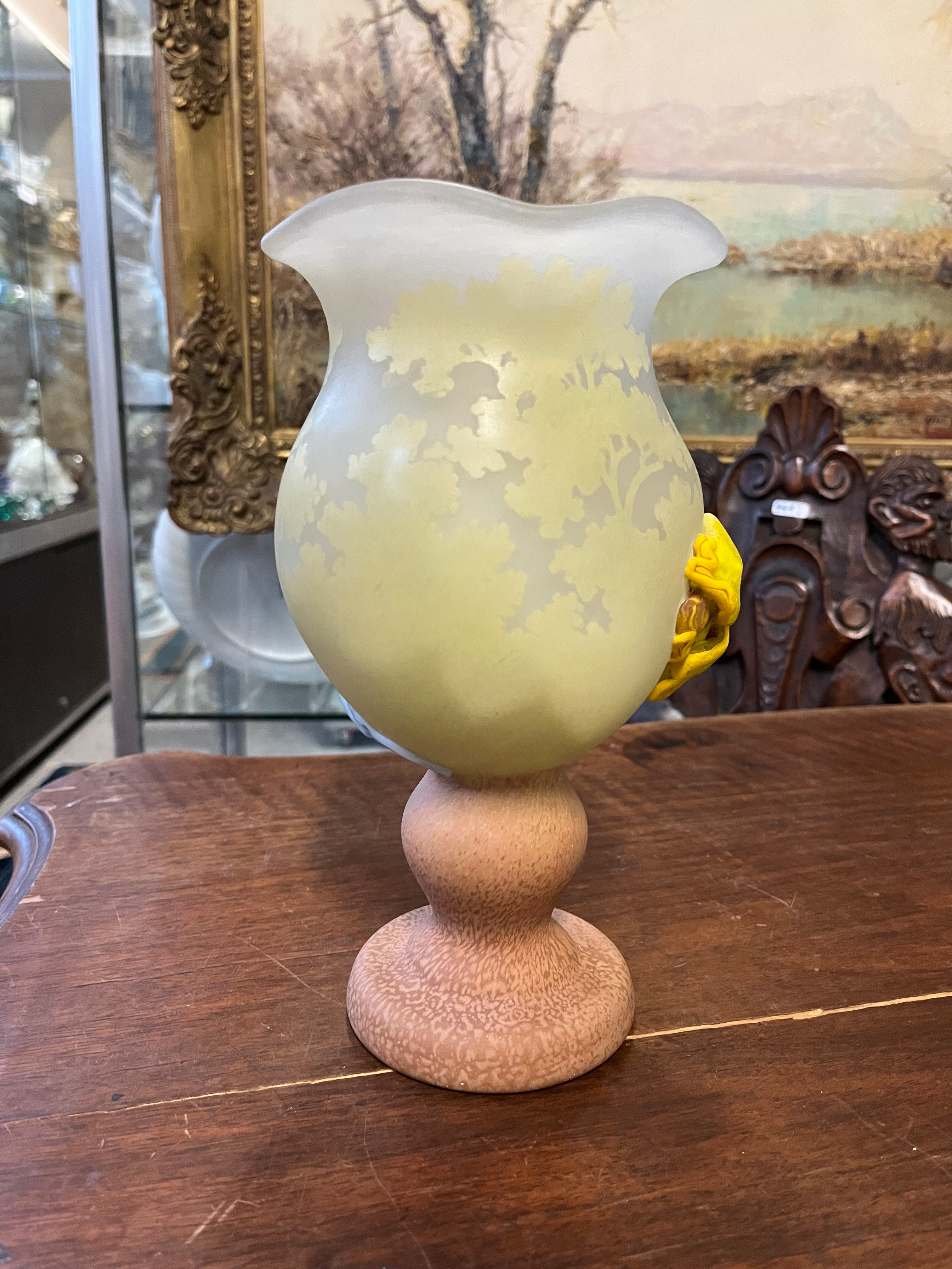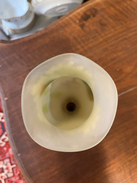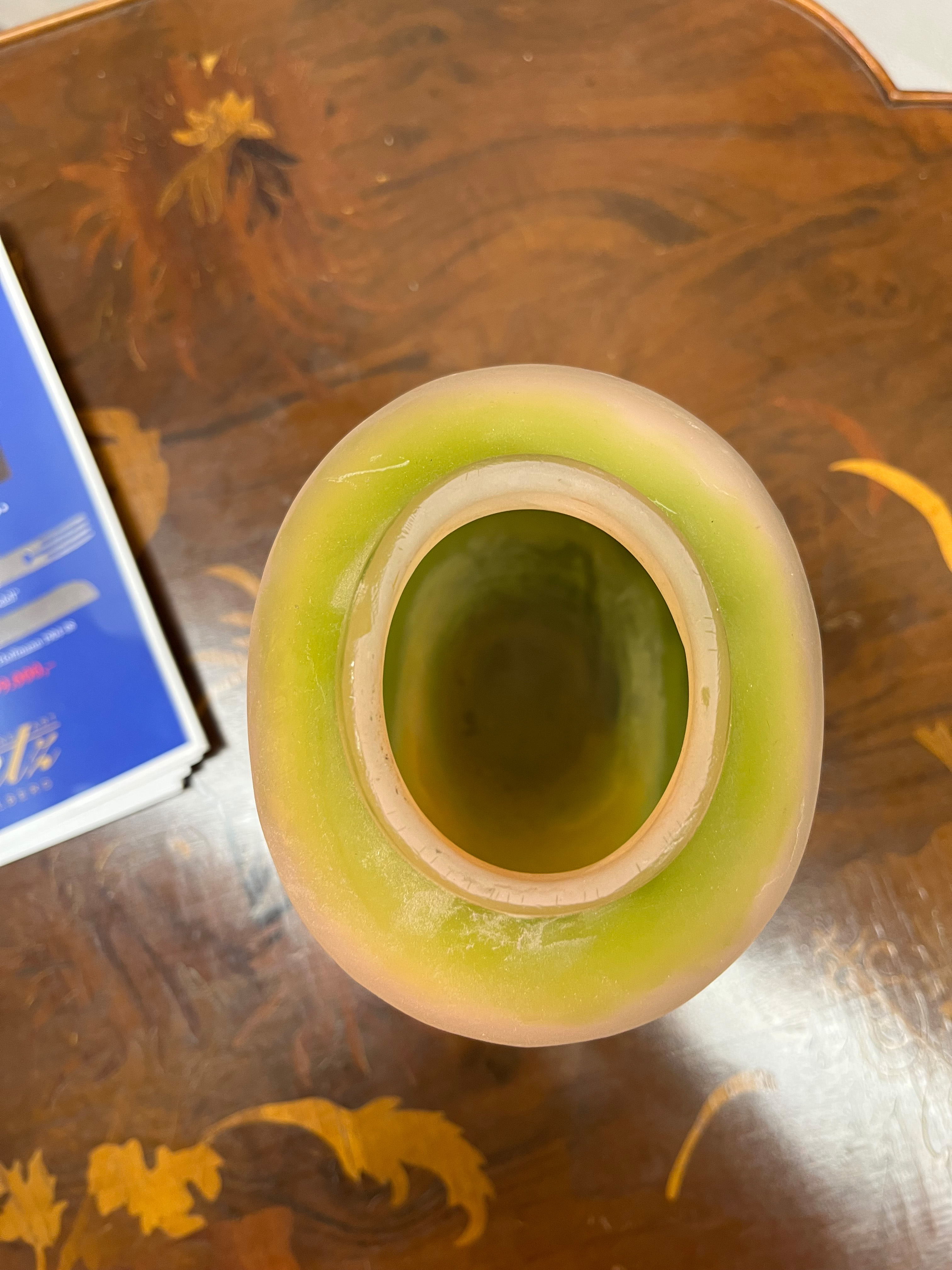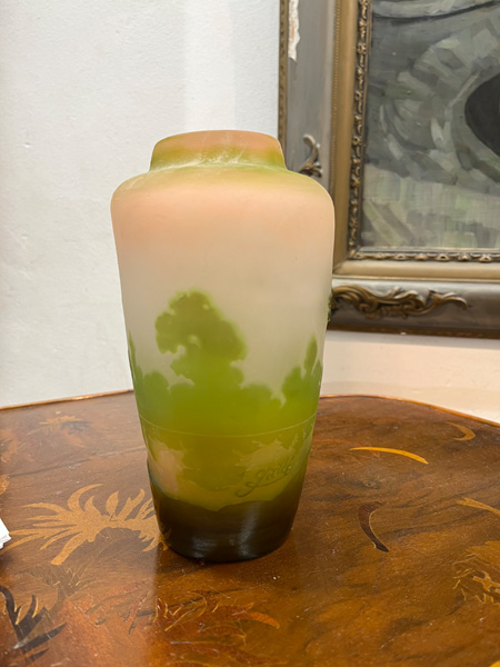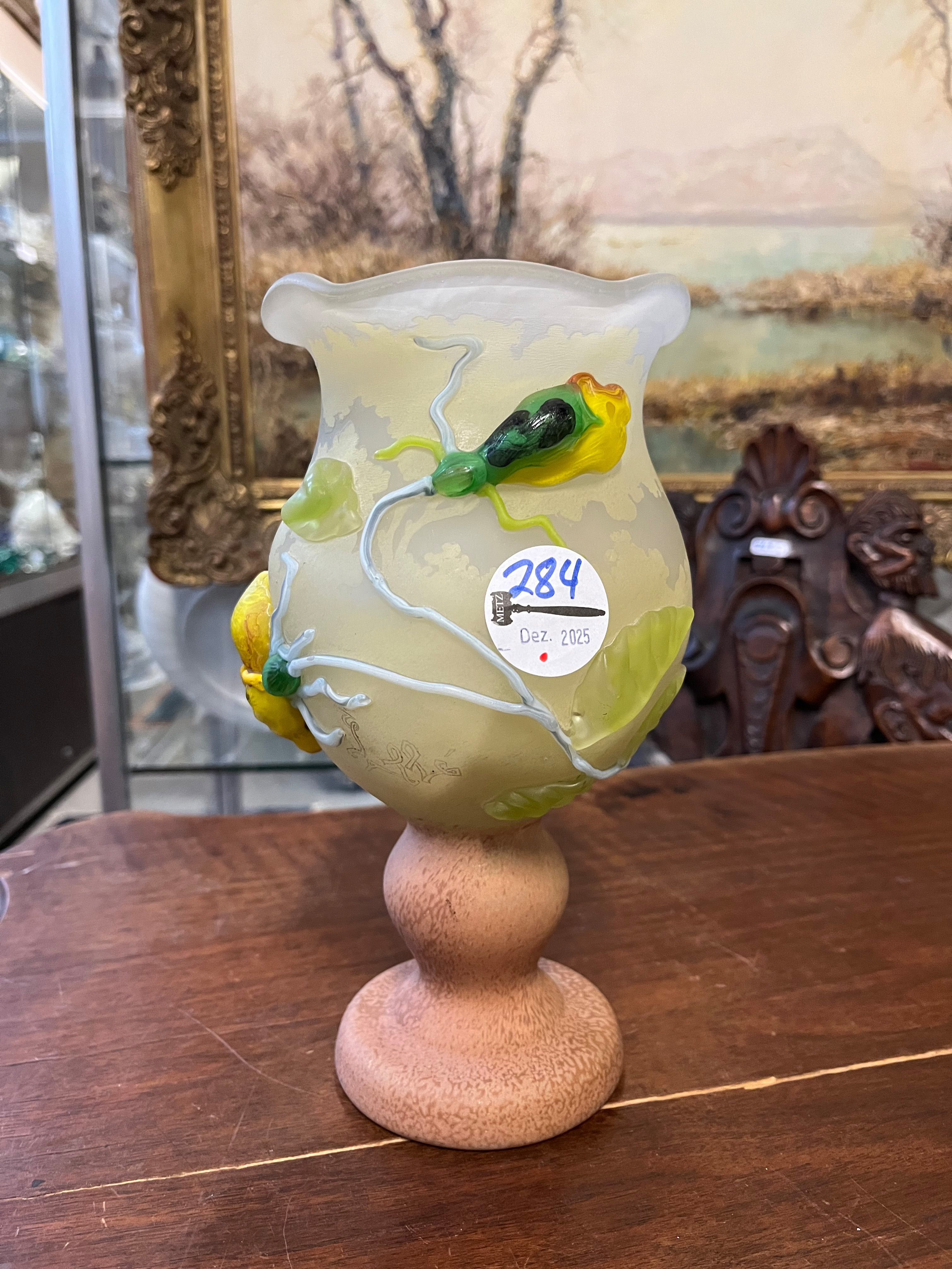 - Katalog-Nr: 277Jugendstil-Vase. Nancy, Émile Gallé um 1900. Farbloses Glas, farbig überfangen, umlaufend mit Uferlandschaft geschnitten; an der Wandung sign., H=16 cm.o.L.
