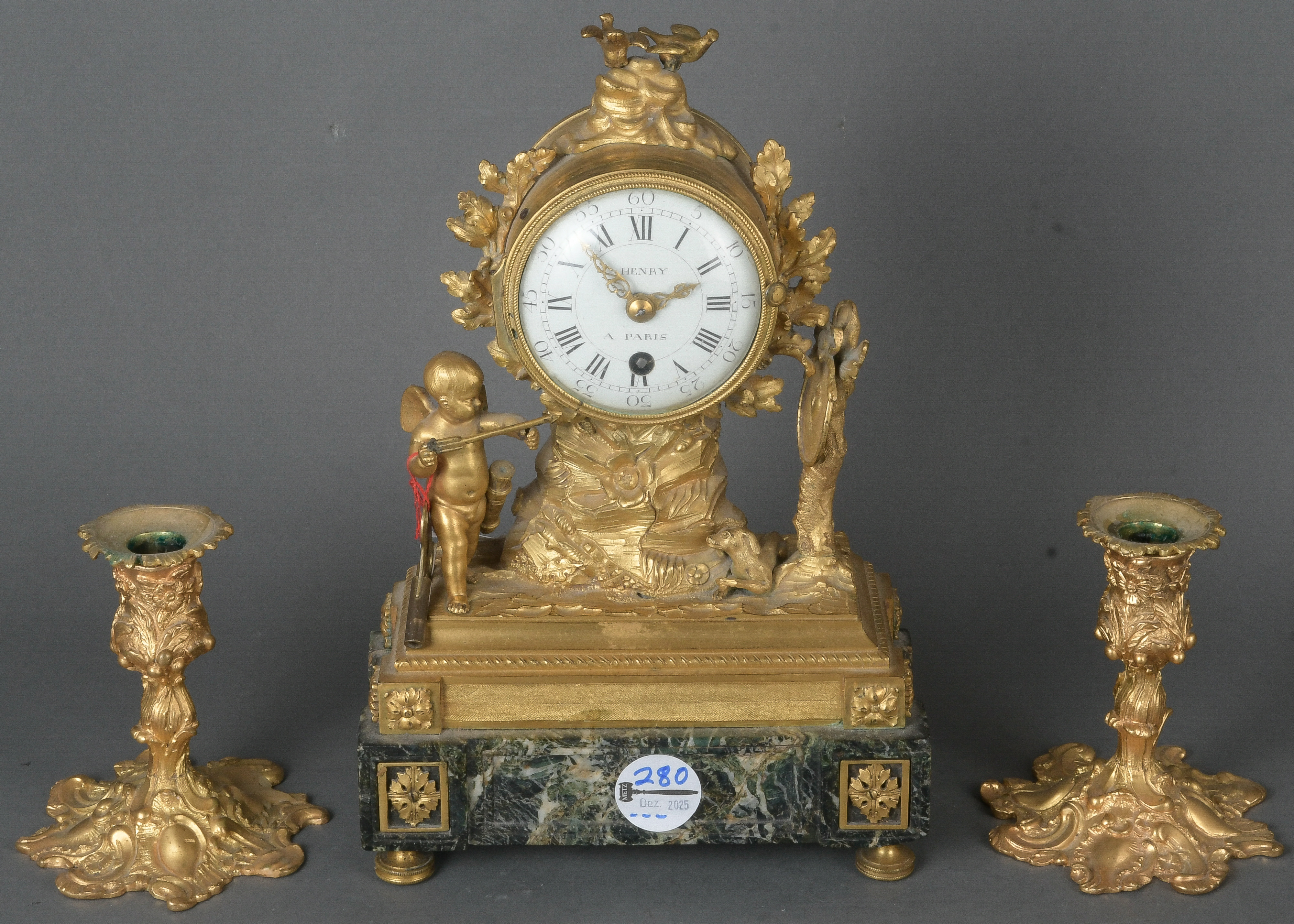 - Katalog-Nr: 280Dreitlge. Kaminuhrengarnitur. Paris, (Marc) Henry 19. Jh. Bronze, feuervergoldet, auf Marmorsockel. Bestehend aus: Kaminuhr (H=31,5 cm, B=20,5 cm, T=9,5 cm) und ein Paar Leuchter (H=je 13 cm). (Funktion ungeprüft)o.L.