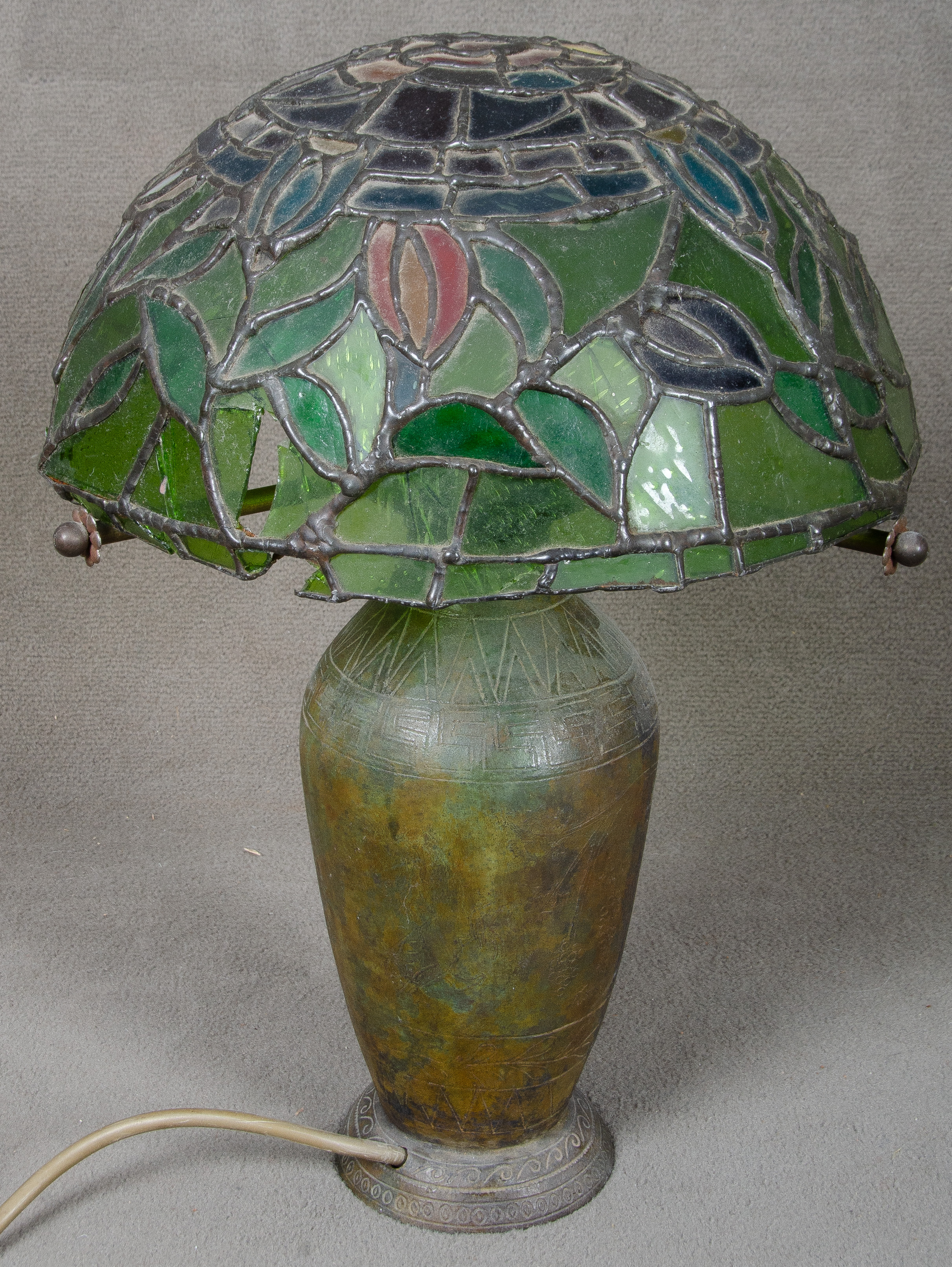 - Katalog-Nr: 282Tischlampe. USA. Mit vasenförmigem Eisenfuß und halbkugelförmig bleiverglastem Schirm, H=37 cm, D=25 cm. (Funktion ungeprüft)o.L.