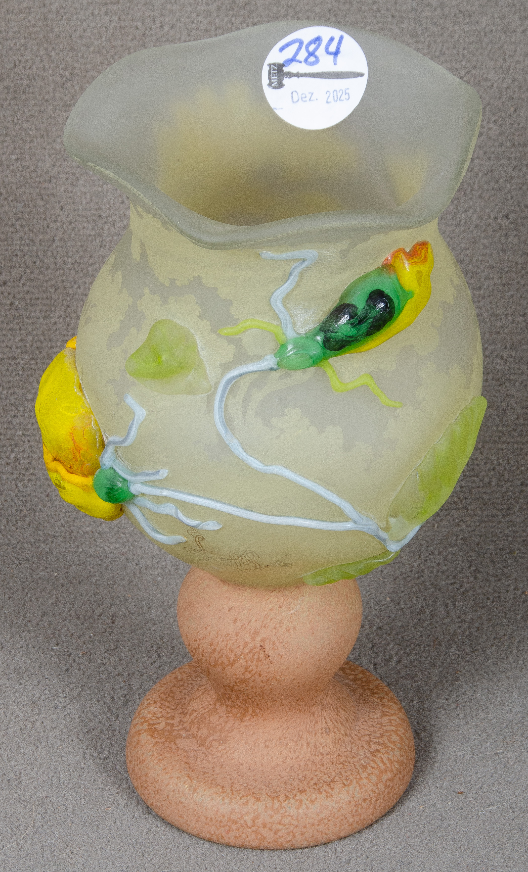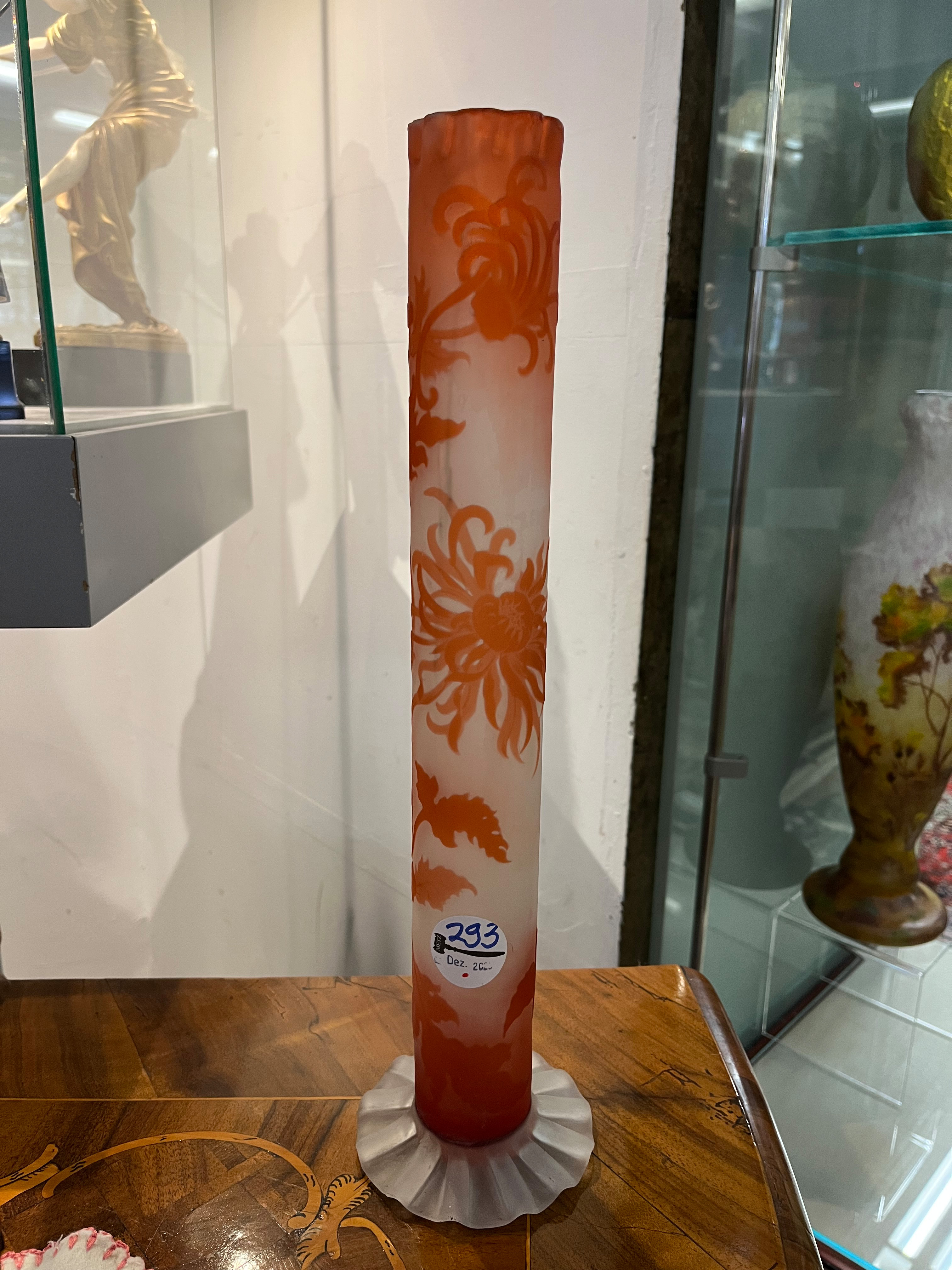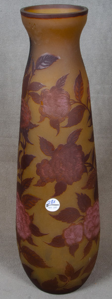 - Katalog-Nr: 293Jugendstil-Stangenvase. Nancy, Émile Gallé um 1900. Farbloses Glas, farbig überfangen, umlaufend floral geschnitten, geätzt und poliert; an der Wandung sign., H=39,3 cm.o.L.