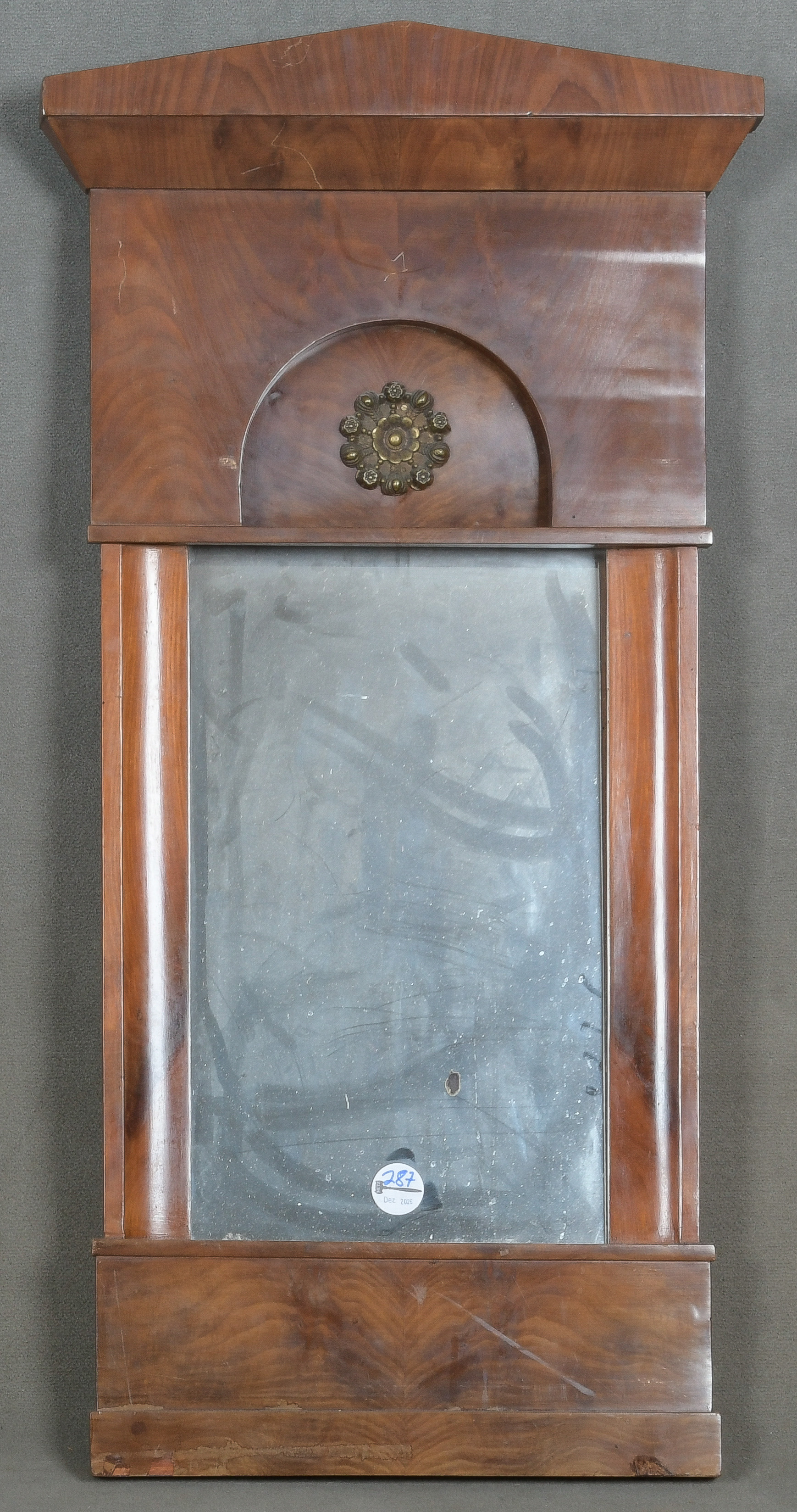 - Katalog-Nr: 287Kleiner Biedermeier-Spiegel. Norddeutsch 19. Jh. Mahagoni furniert, teilw. massiv, mit Messingrosette; profilierter Rahmen mit Spitzgiebel, 87 x 43 cm.o.L.
