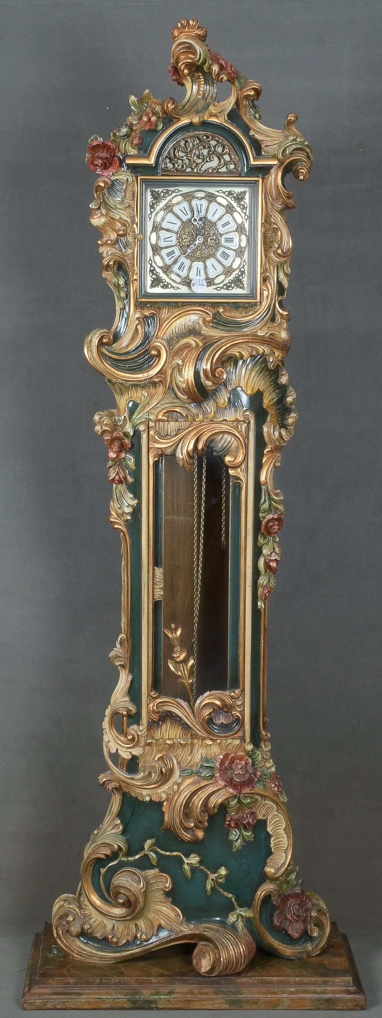 - Katalog-Nr: 289Standuhr. Frankreich 20. Jh. Massivholz, aufwendig geschnitzt, auf Kreidegrund gefasst und gold gehöht; sich nach unten verbreiternder Uhrenkasten mit gebogenem Giebel, Uhrwerk verso sign. „Romanet Morbier“, mit drei Gewichten, H=196 cm, B=60 cm, T=30 cm. (Funktion ungeprüft)o.L.