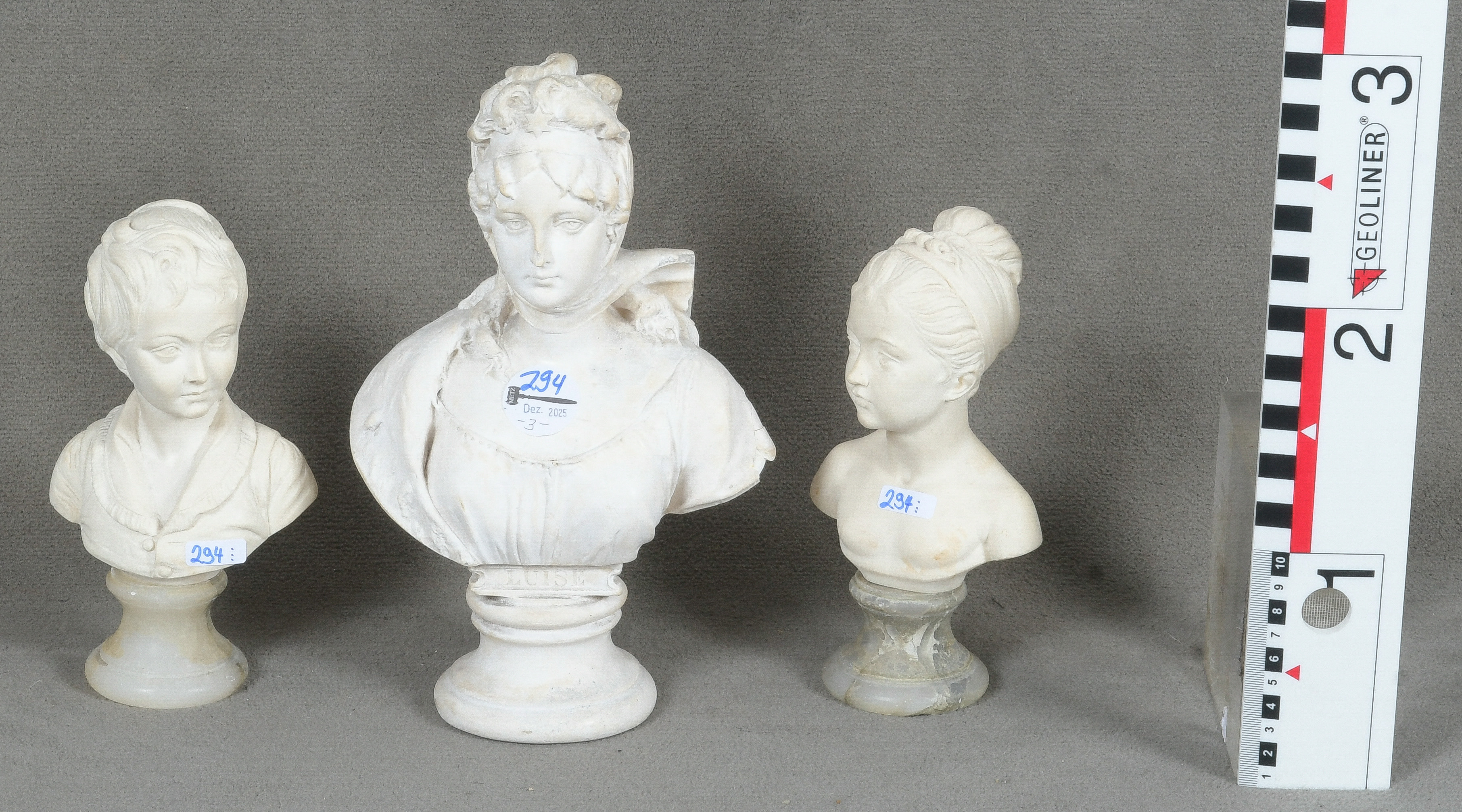 - Katalog-Nr: 294Drei Büsten auf Sockel, u.a. Königin Luise von Preußen. Deutsch 20. Jh. Gips / Kunstmasse, H=20 bis 27 cm. (eines best.)o.L.