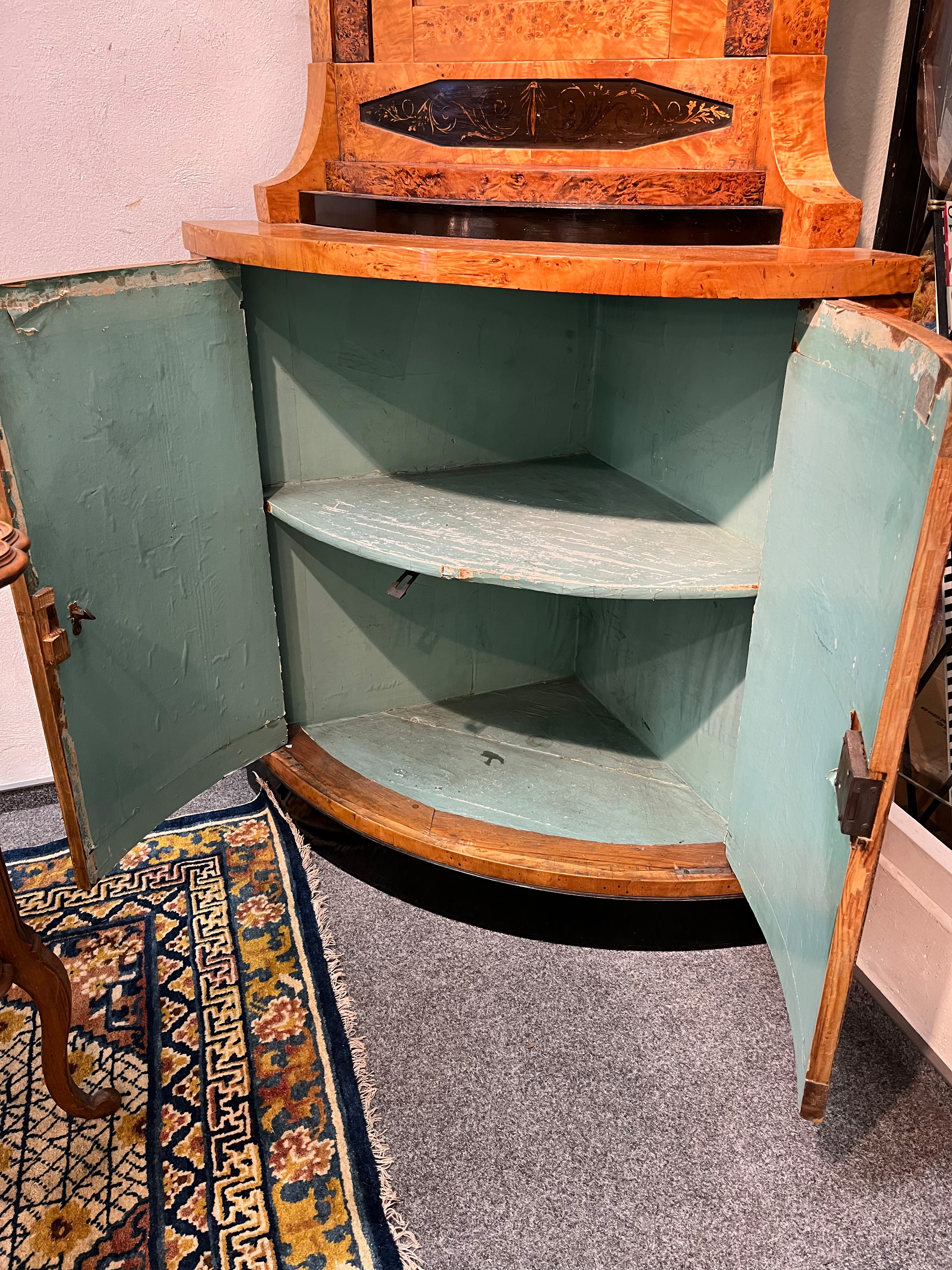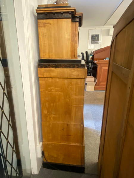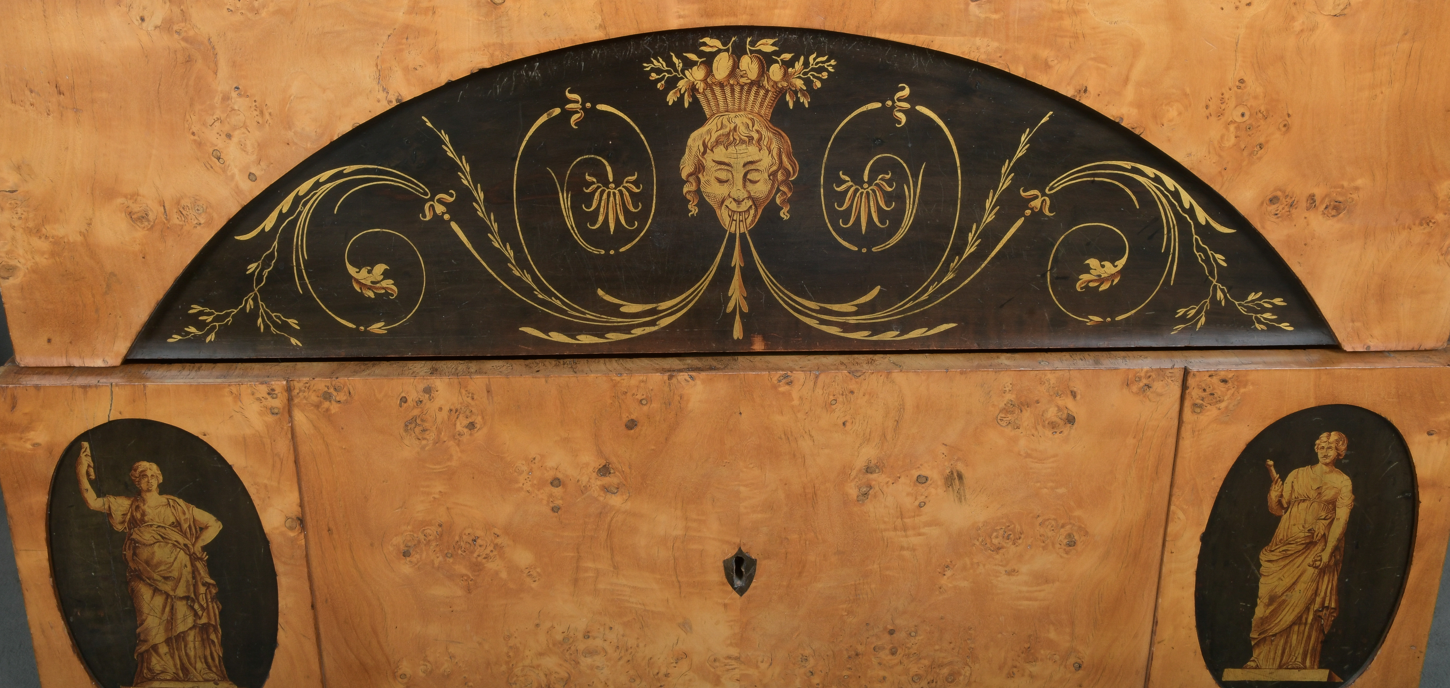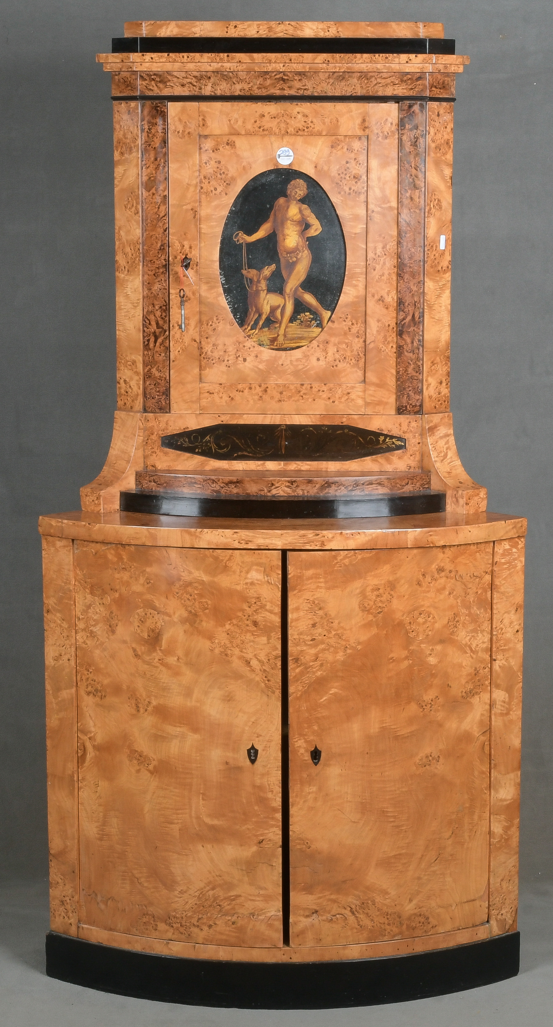 - Katalog-Nr: 300Biedermeier-Eckschrank. Weimar 1810-15. Passend zur Vornummer. Vogelaugenahorn furniert, teilw. ebonisiert und bemalt mit mythologischen Szenen; gerader Sockel, zurückgesetzter, eintüriger Aufsatz, abgeschrägte, nach unten leicht gebogene Lisenen, feinstens gearbeitet mit fortlaufendem Furnierbild, gerade Platte, getreppter, profierter Giebel, H=181 cm, ST=63 cm. (alte Patina)o.L.