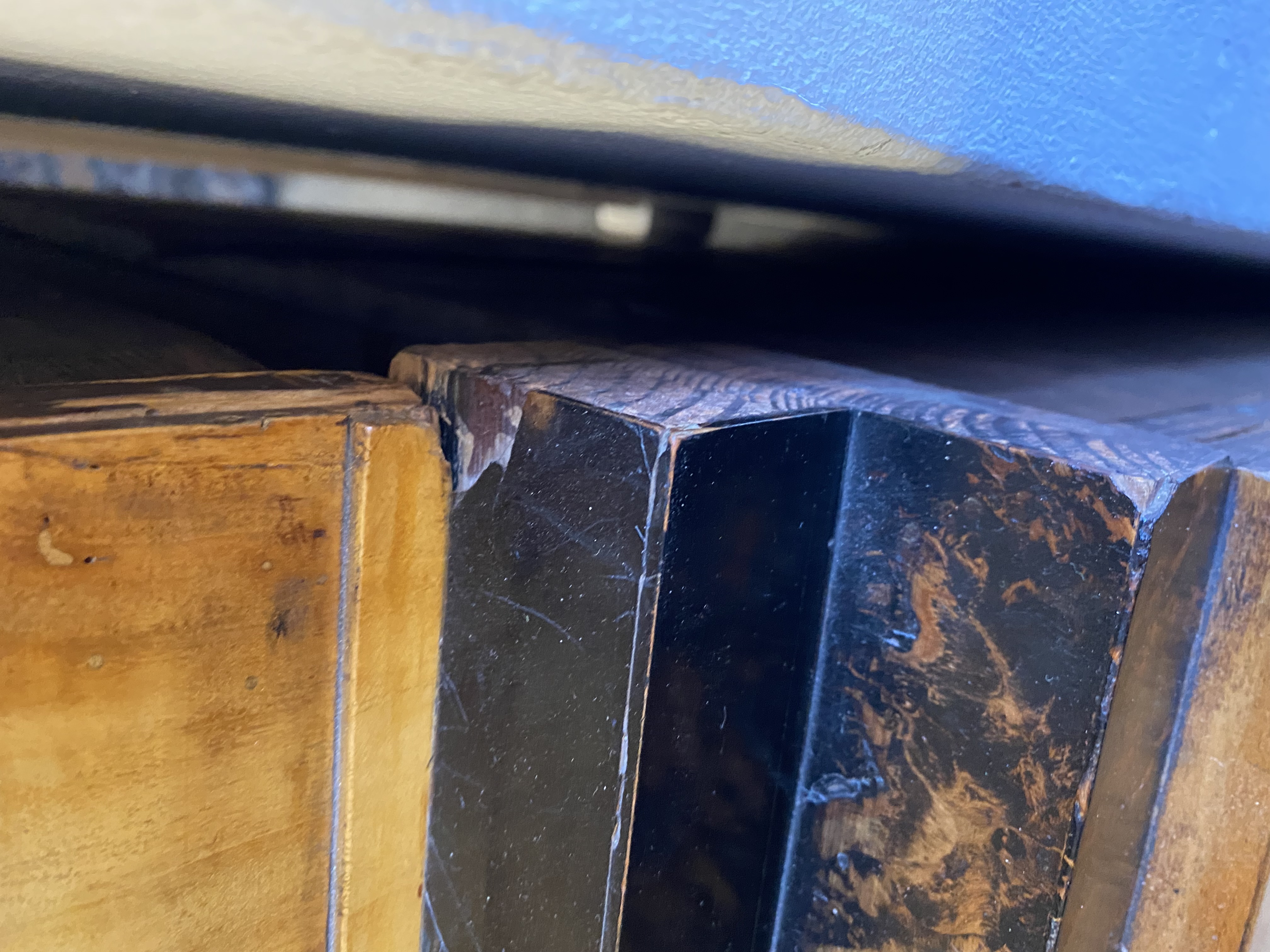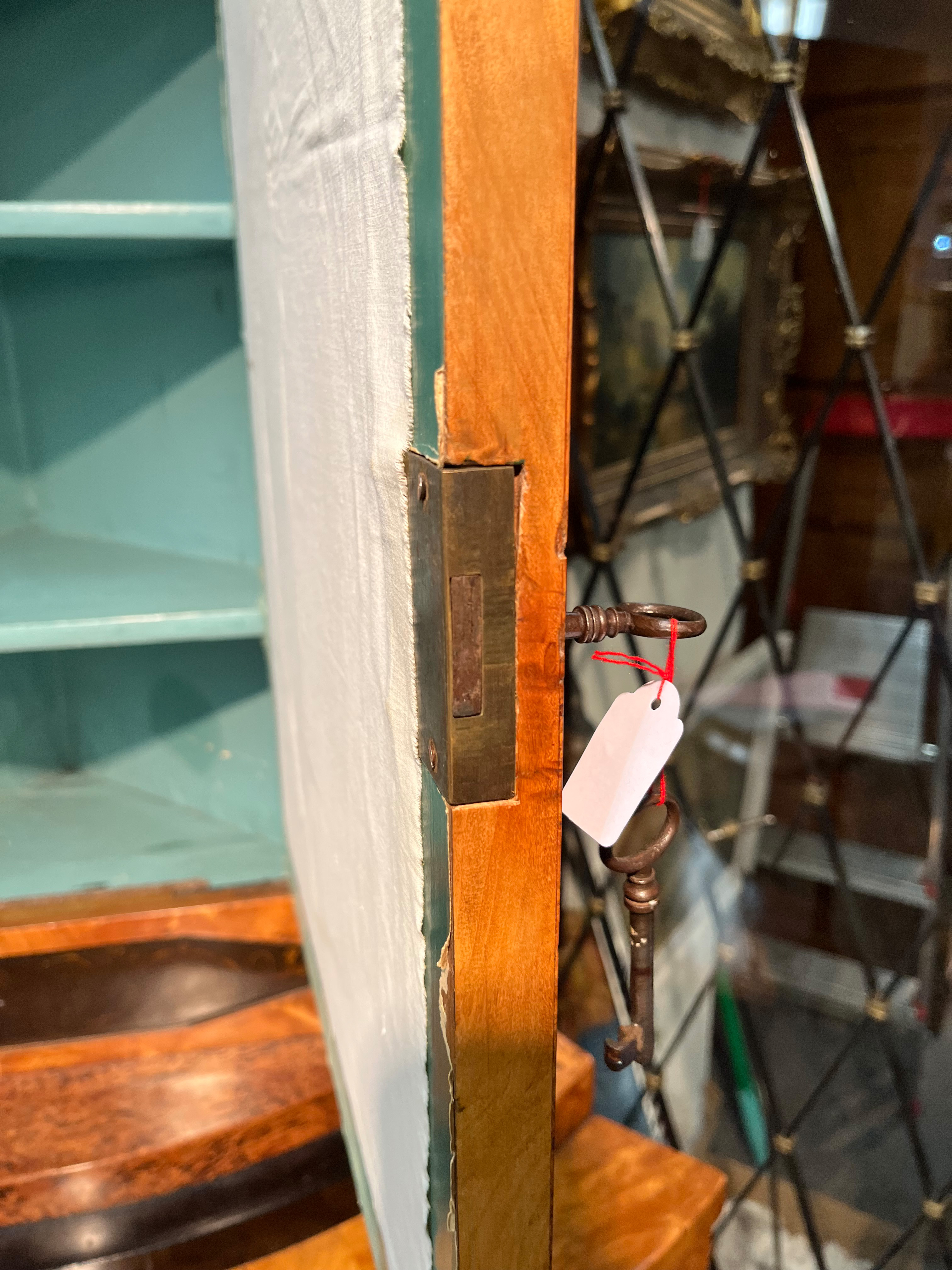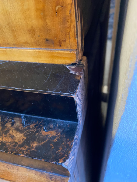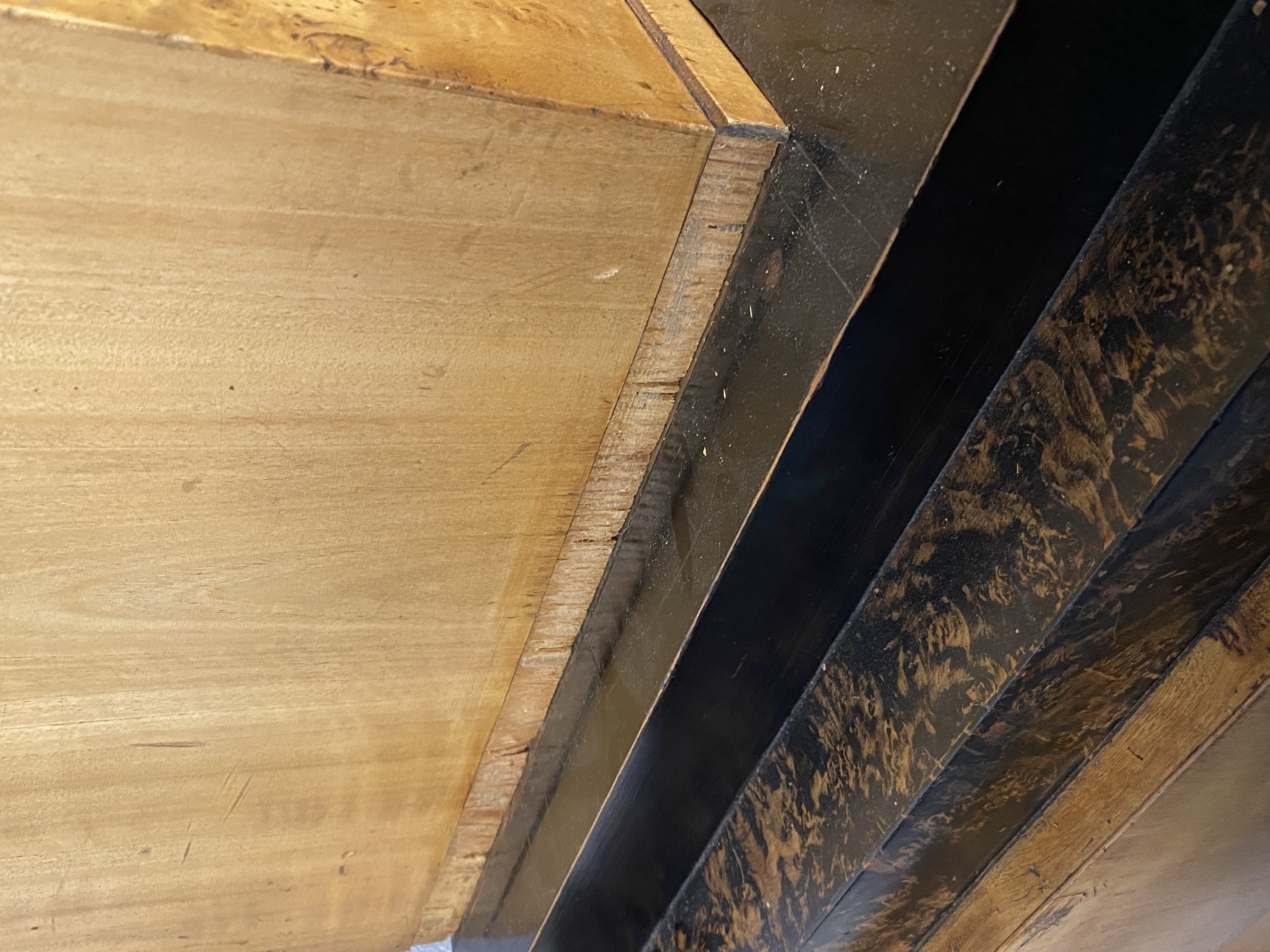 - Katalog-Nr: 300Biedermeier-Eckschrank. Weimar 1810-15. Passend zur Vornummer. Vogelaugenahorn furniert, teilw. ebonisiert und bemalt mit mythologischen Szenen; gerader Sockel, zurückgesetzter, eintüriger Aufsatz, abgeschrägte, nach unten leicht gebogene Lisenen, feinstens gearbeitet mit fortlaufendem Furnierbild, gerade Platte, getreppter, profierter Giebel, H=181 cm, ST=63 cm. (alte Patina)o.L.