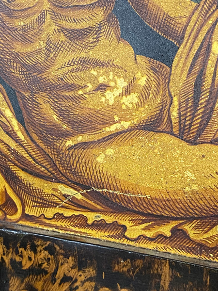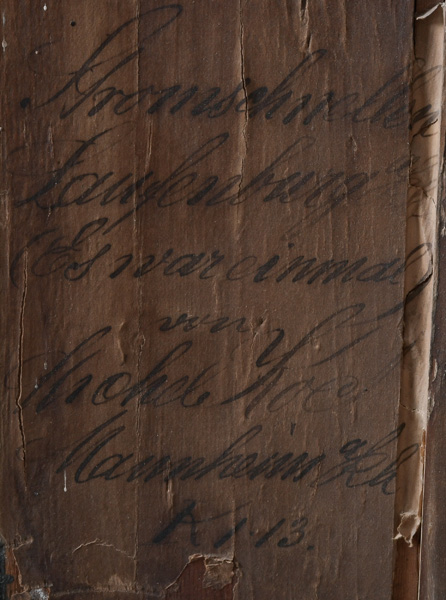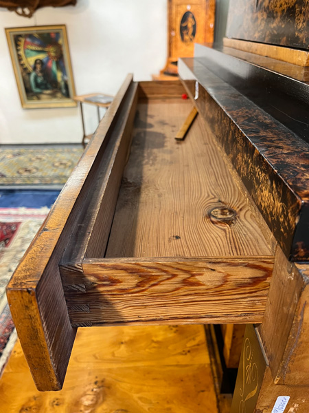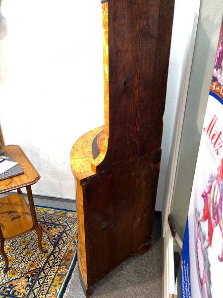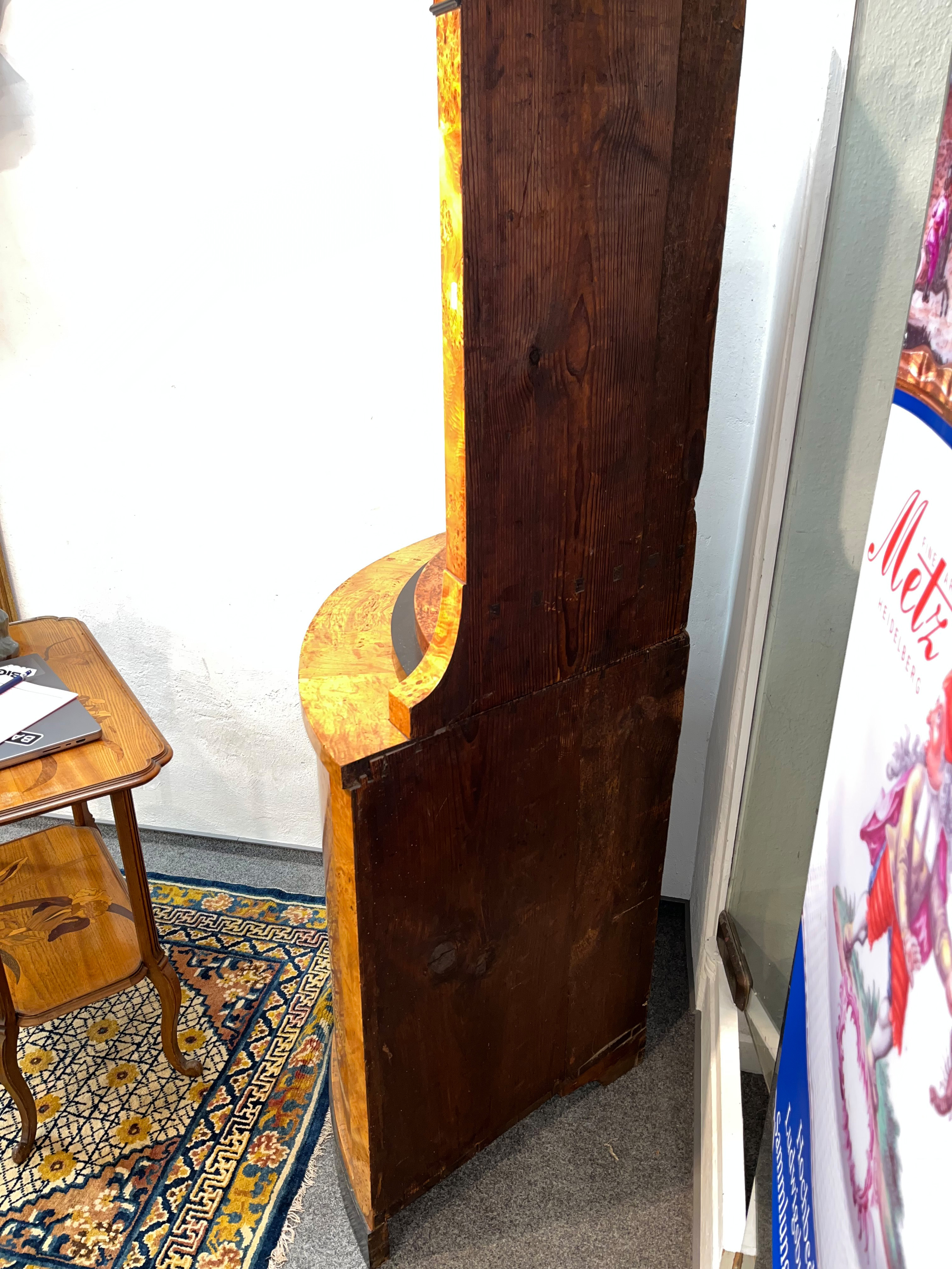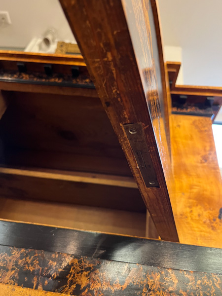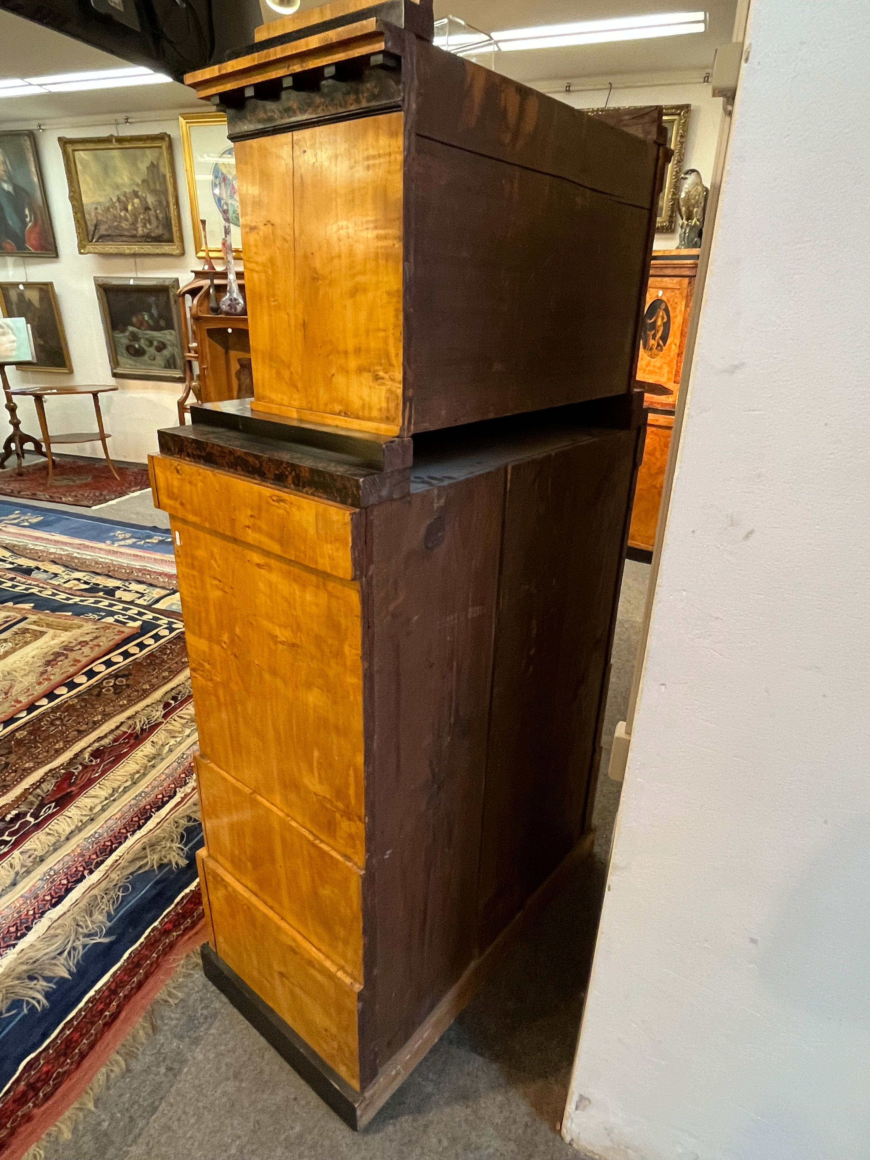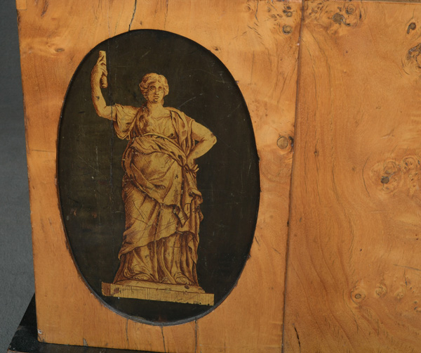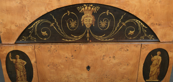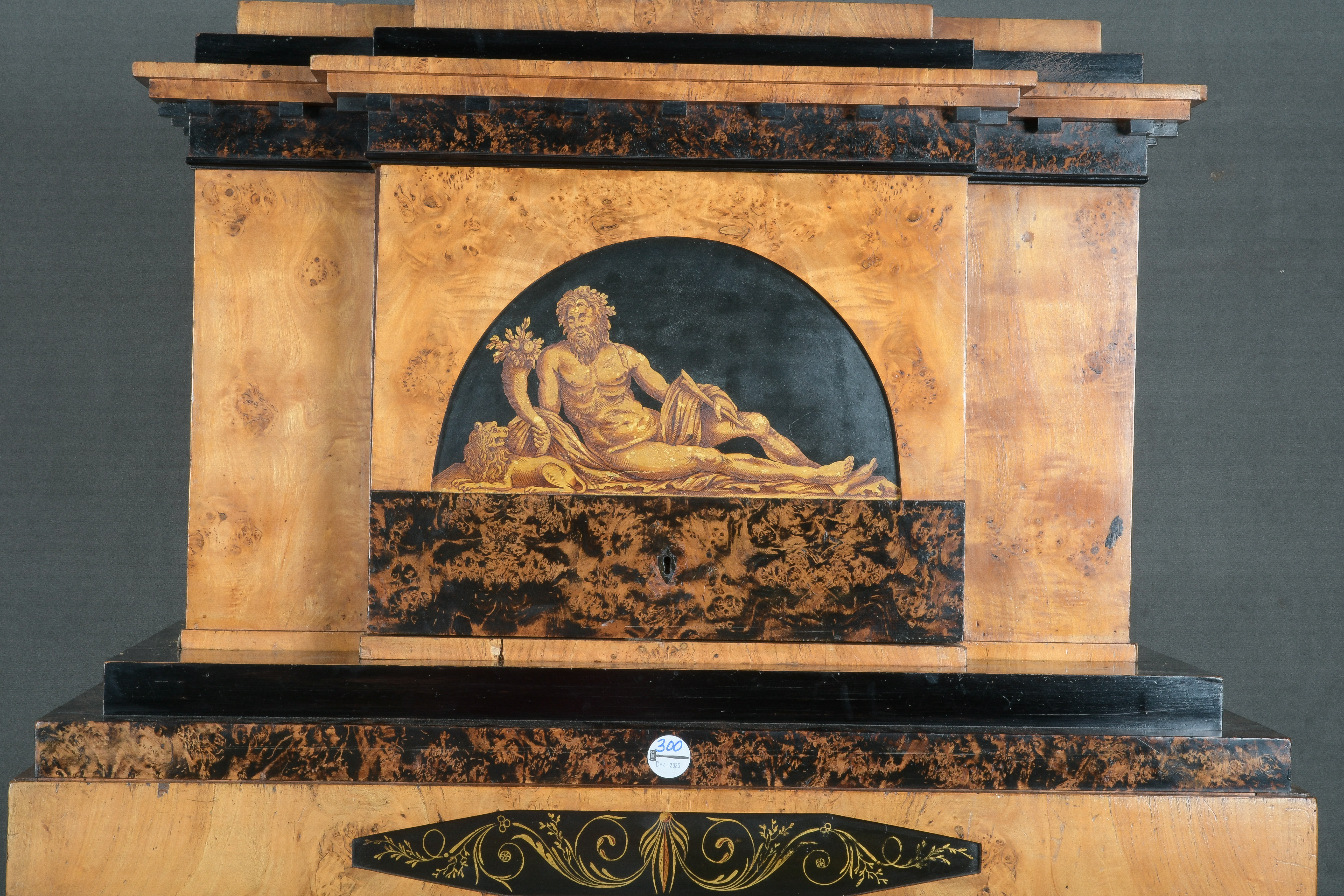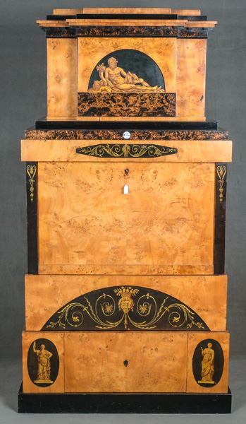 - Katalog-Nr: 299Biedermeier-Standsekretär. Weimar 1810-15. Vogelaugenahorn furniert, teilw. ebonisiert und bemalt mit Blättern, mythologischen Motiven - wohl Hirtenszenen mit Raja, Rauta und Paika - und Rocaillen; getreppter Sockel und Gesims, teilw. mit Zahnschnitt, zwei Schübe, darüber Schreibklappe mit aufwendigem Innenleben, zurückgesetzter, eintüriger, verkröpfter Aufsatz, H=188 cm, B=94 cm, T=49,5 cm. (alte Patina)o.L.