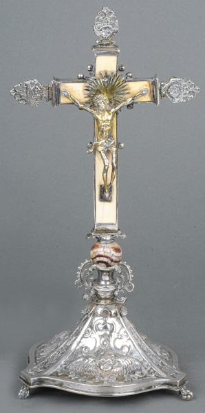 - Katalog-Nr: 279Kruzifix. Nürnberg, Meister Paulus Bair 1613. Dreipassiger Sockel auf drei „Claw-and-Ball“-Füßen. Spitz zulaufend, sich nach oben verjüngend, mit seitlich durchbrochenen S-förmigen Spangen, darauf ruhende Kugel und weiterverlaufendes Kreuz mit Christusfigur. Silber, ca. 300 g, am Boden Stadt- und Meisterpunze mit Tremolierstrich, H=27,5 cm.o.L.