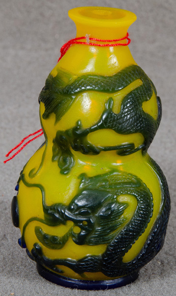 - Katalog-Nr: 285Snuffbottle. Asien. Farbloses Glas, farbig überfangen und umlaufend reliefiert mit Drachendekor, H=8 cm.o.L.